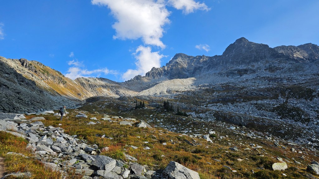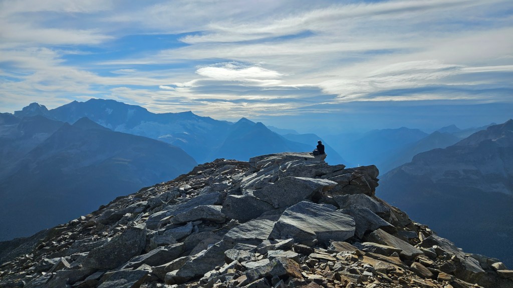 We eventually trended to our left towards the grassy ledges for a portion of the descent until back to the slab-gully mentioned earlier. Once across this gully we returned the ridge again for our descent to Avalanche Crest. While we had avoided the more technical portions of the ridge, this last stretch proved quite tedious with boulder hopping and it was a massive relief to reach the broader solid footing of the Avalanche Crest. We had made our weather window, and were off the technical terrain as the winds picked up and the temperatures dropped. A dark cloud burst seemed to be lingering above the north end of Rogers Pass so we took few breaks on the hike back to car. As we descended off the last stretch of Avalanche Crest back to the main hiking trail we finally caught our first and only glimpse of the group behind us. Glad to see that they were okay and likewise on their return journey, and so odd that we hadn’t caught sight of them earlier in the day. We hustled back to the car as the temperatures continued to drop and could feel the atmosphere getting damper, thankfully the rain held off till the drive home! A great scramble for the Rogers Pass area.