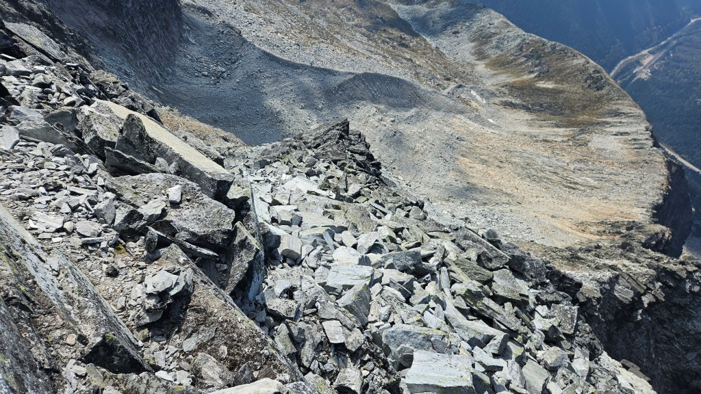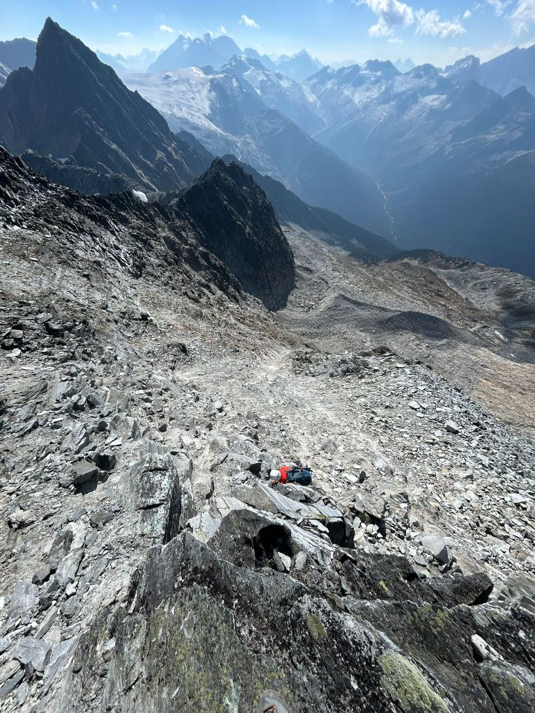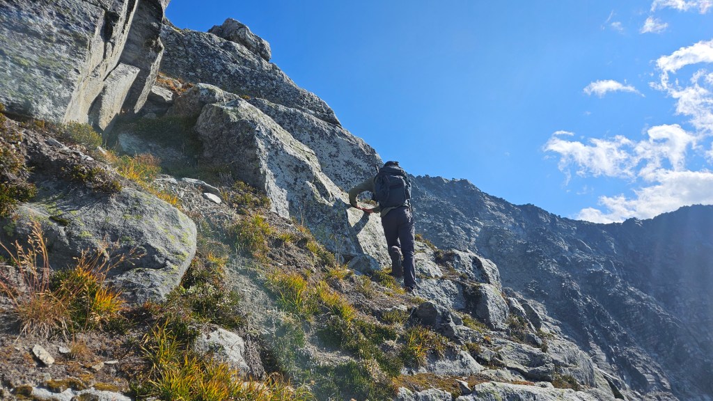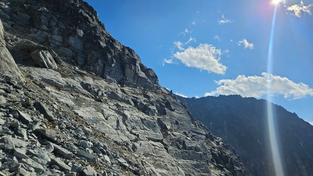 On the return journey we stuck closer to the southwest ridge, only deviating back towards the grassy ledges as to avoid the more exposed sections of the ridge itself. Somewhere along the way we spotted what looked like a freshly forgotten Nalgene bottle which was both eerie and comical, as it seemed to indicate that I had in fact been hearing another group! We still hadn’t spotted said group… but had noticed some minor rock fall from above and until then had assumed it was from our own travel. We left the bottle where it was but made it more obvious to spot in case its owner came back for it.