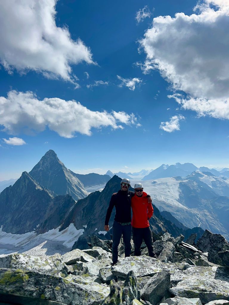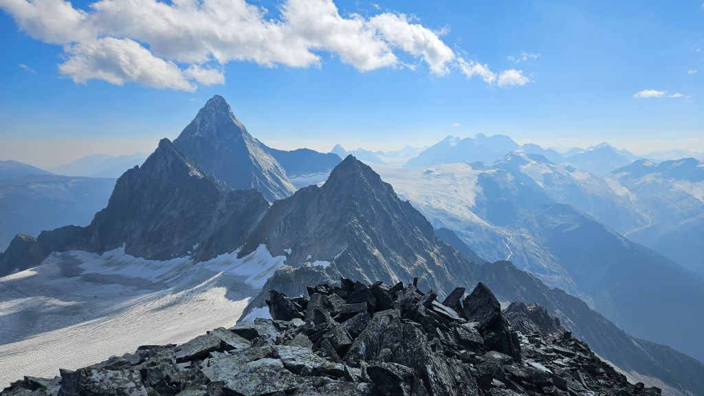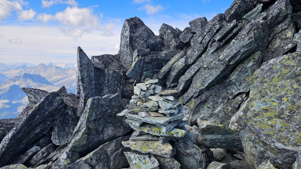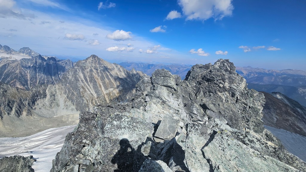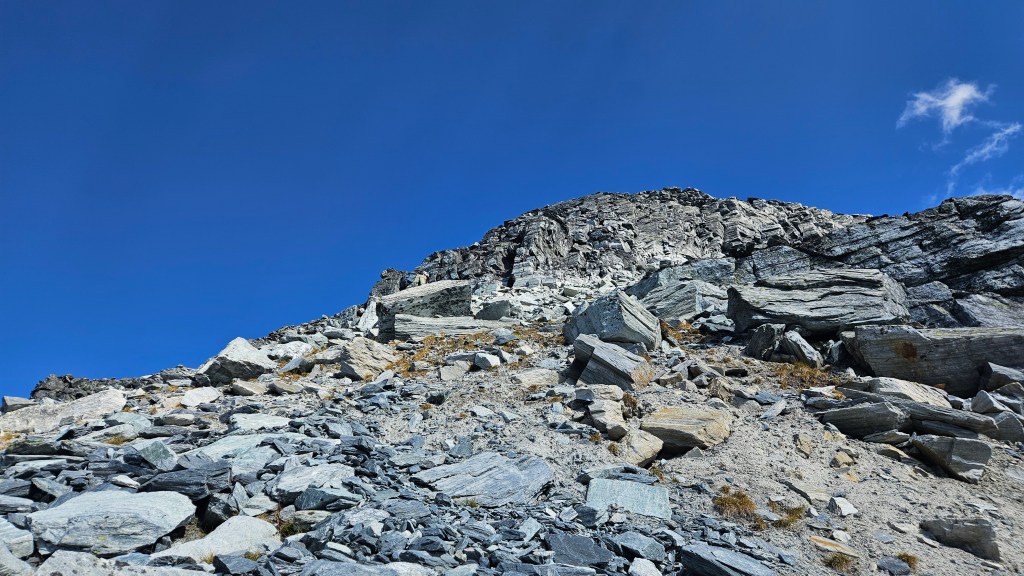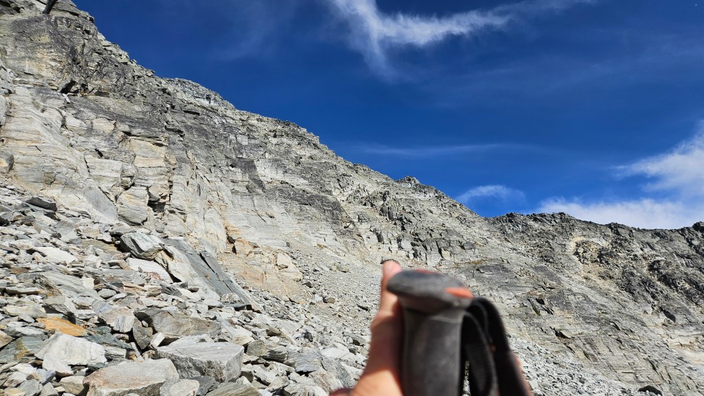 The crux for us ended up being an exposed ledge roughly twenty minutes beneath the summit where our route had nearly rejoined the southwest ridge crest. The only distinguishing feature of it for us was a cairn a the top of said ledge, and the ledge itself feeling very much 4th class for a couple meters. Above the “crux” we followed cairns for the remainder of the way to the summit. Again, somewhere near the “crux” I thought I could hear another party behind us but we still couldn’t see anyone and both brushed it off as the wind carrying sound from afar. On the note of the wind, it was picking up towards the top and brought a lot of dust up from the lower slopes with it. We often had to mask up with our buffs to keep the grit out of our teeth and nose.