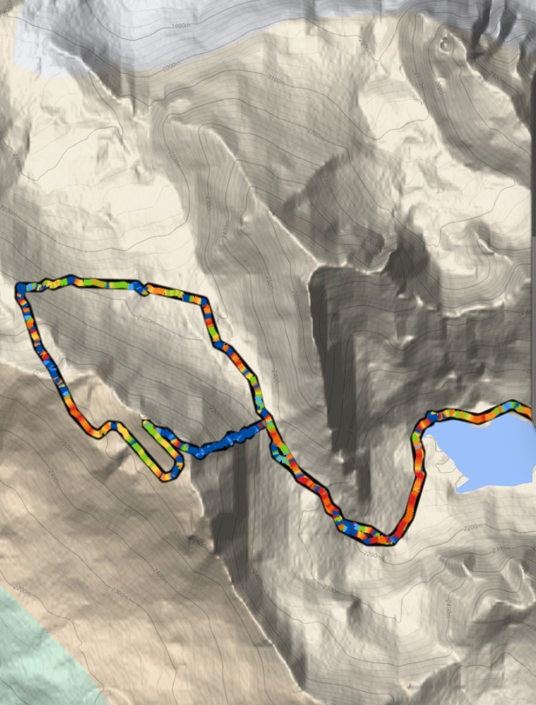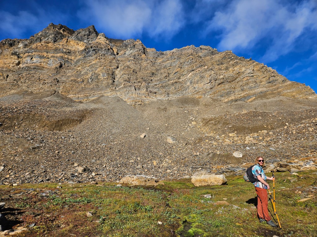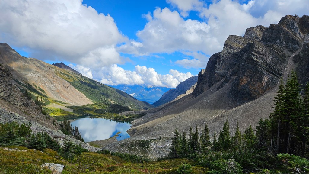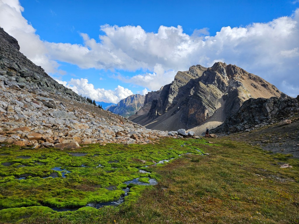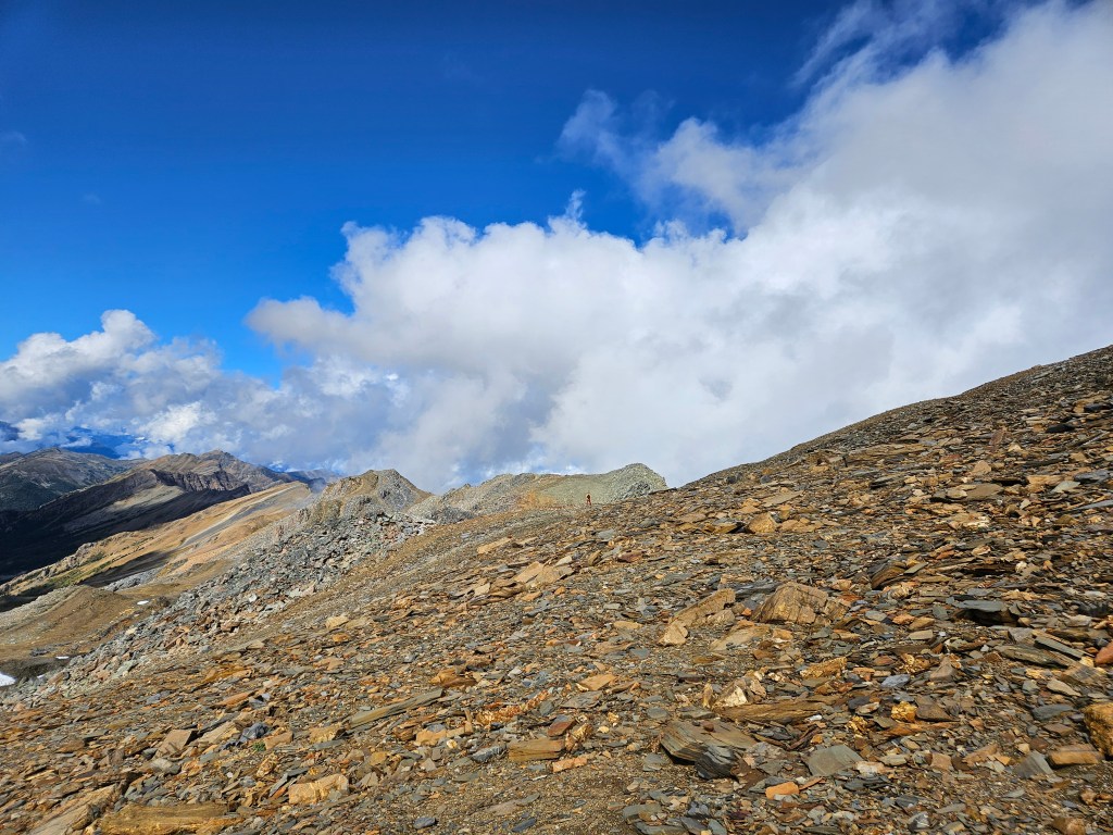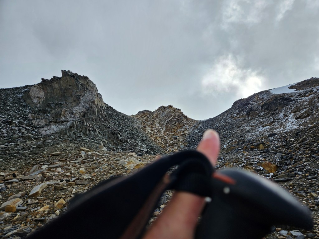 At first we tried following the ridge directly north from the summit but were soon cliffed out and had to back track south past the summit to circumnavigate these. Some mild route finding was required as to not down-climb the western slope too far before resuming our traverse north. Once under and past the cliff bands, it became quite obvious where to go and we even encountered some cairns. These lead us to a shallow bowl feature, and from there we dropped onto to a northeastern slope staying south (looker’s right) of a small pocket glacier. We angled south back towards the Bokor-Zombie col, side hilling above the moraine, though there were several opportunities to fully descend into the valley bottom. In side hilling across we minimized the amount of elevation loss before having to drop into the moraine and hike back up to the col. It was on the way out of the moraine that we encountered two hunters, whom were the only two other people we saw that day past the lake.