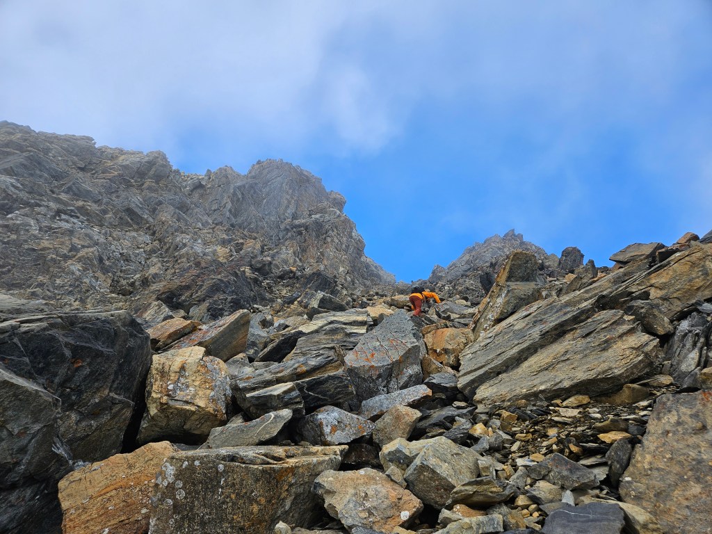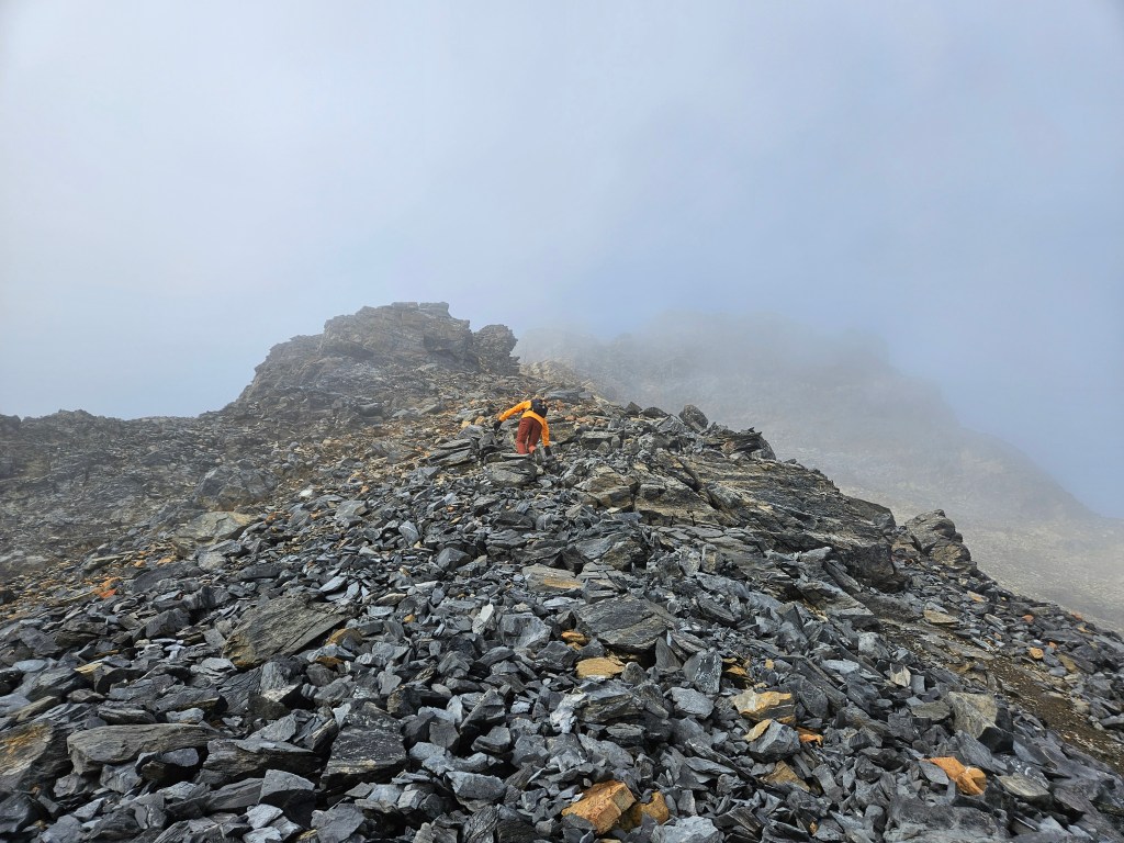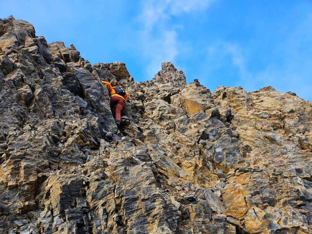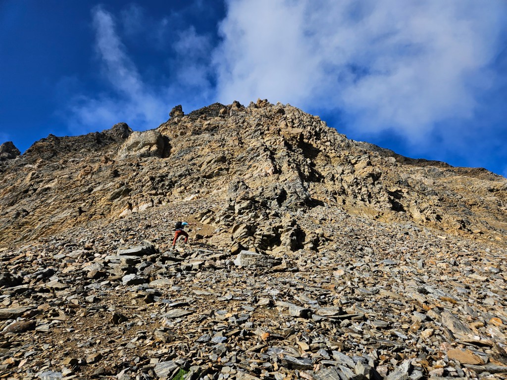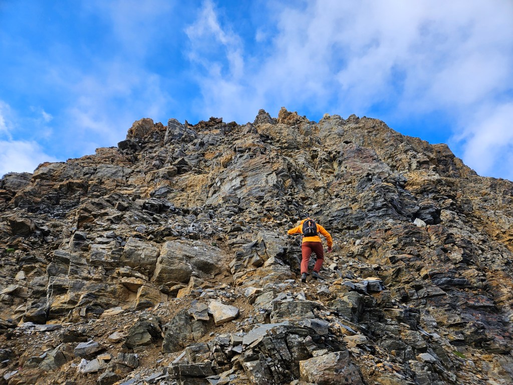 In total the East Ridge took us two hours to scramble up to ridgeline, with a brief few minutes ridge walk to the peak’s summit. The first hour twenty minutes saw us zig-zagging up a series of steep crumbly ledges with several exposed sections. A fall from this route would be crippling, if not fatal. We took our time, carefully testing the holds before committing, and waiting for each other to be clear of rock fall zones.