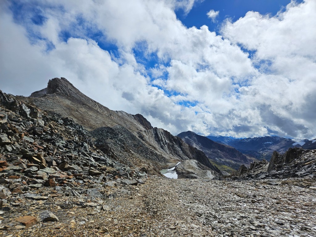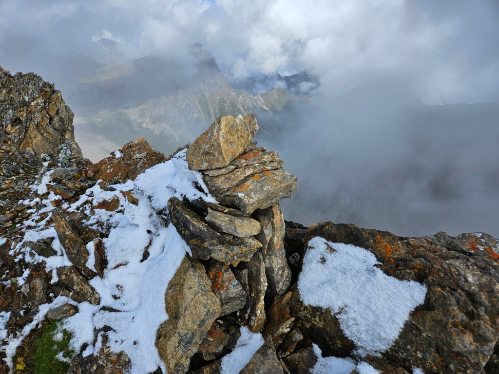 The summit itself was somewhat underwhelming compared to the route we had scrambled up, being a mere bump along a gentle broad ridgeline. We summited around noon, and while we found the summit cairn there was seemingly no register within (dang it, could have brought one up!). The winds were brisk, lifting some of the cloud cover to the west and north. Excellent views even with partial cloud cover. I had decided earlier on that I was not keen to downclimb back down that east ridge, so we decided to route find our way to the longer easier route described on Golden Scrambles.