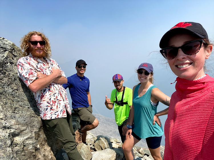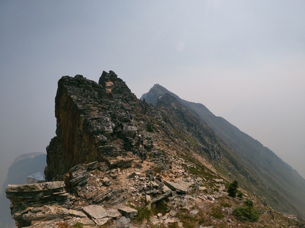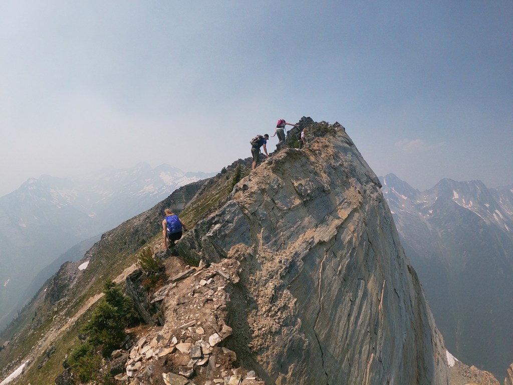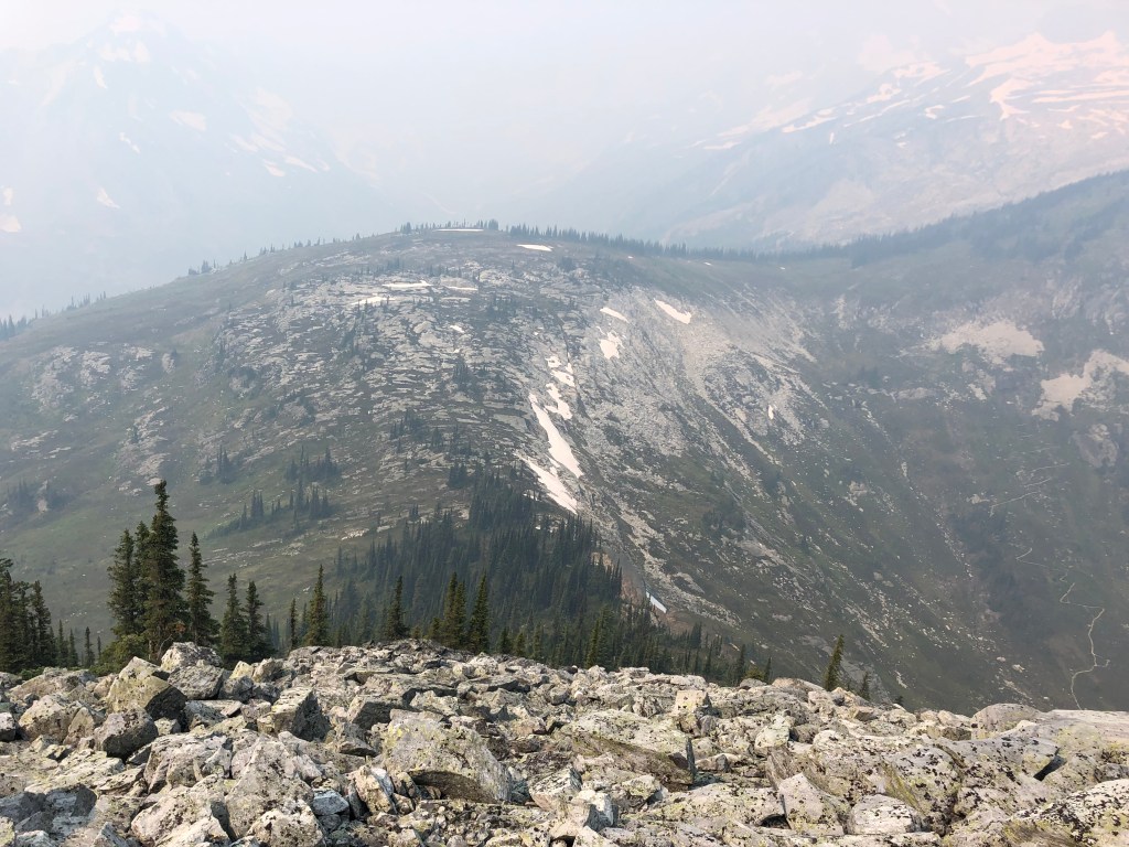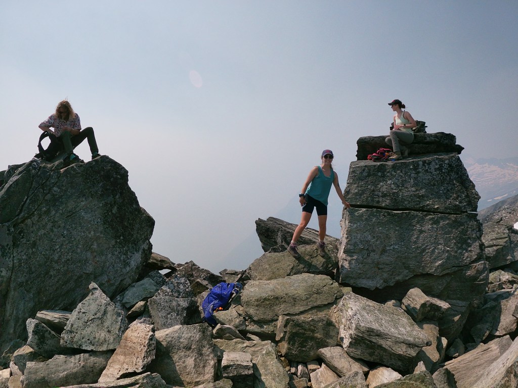 We reached the summit around 12:50pm, taking our team 4.5 hours from the carpark to top out. The summit was composed of several ‘pillars’ which made for a neat yet tight break spot. The smoke was still quite hazy and our best view was looking back towards Belu Pass, the rest of the Rogers Pass area too hazy to observe. The journey back down across the ridge was as hands on as the ascent, with the exposure off the northside of the ridge much more apparent when facing downhill. We had almost forgotten about the ‘dip’ and loathed the slog back up to Belu Pass, but otherwise the team remained in high spirits most of the journey down. Summit back to car, including breaks, was also 4.5 hours making for a long 9 hour day. It was a great day out with great company, and we will eventually revisit for a scramble up Belu Peak.