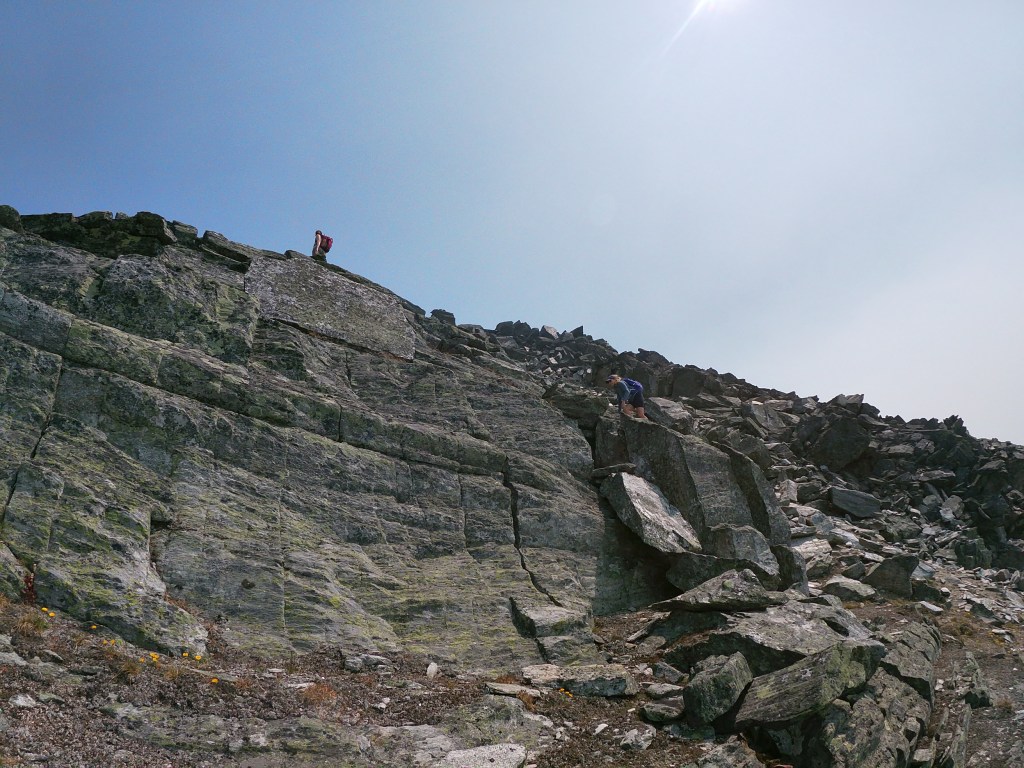 We lost fair chunk of elevation hiking down through the “dip” in order to gain the lower slopes of Cheops’ western ridge, losing at least a hundred metres. When the uphill journey resumed we found ourselves ascending through mixed terrain of trees and boulders. For the most part we stayed to a distinct footpath, occasionally scrambling over the larger boulders. As the trees disappeared the boulder field steepened up Cheops’ western slope eventually tapering towards the ridge crest. On a technical level the slope leading up from the “dip” to the ridge was easy, however this section was nothing short of a slog fest. The actual ridge was foreshortened by the smoky haze and more than once we as a group thought we had crested onto the ridge only discover yet more talus slope above.