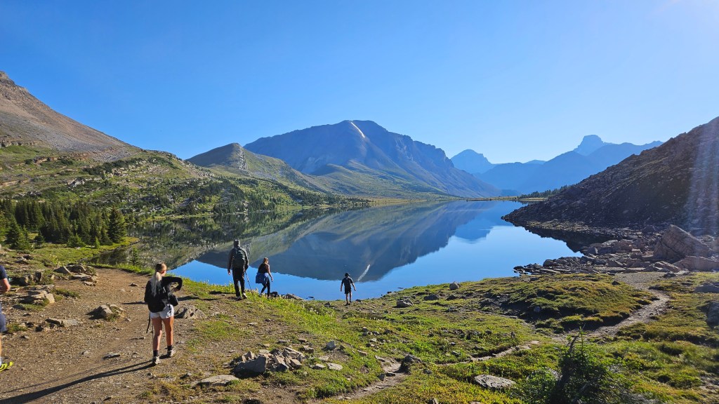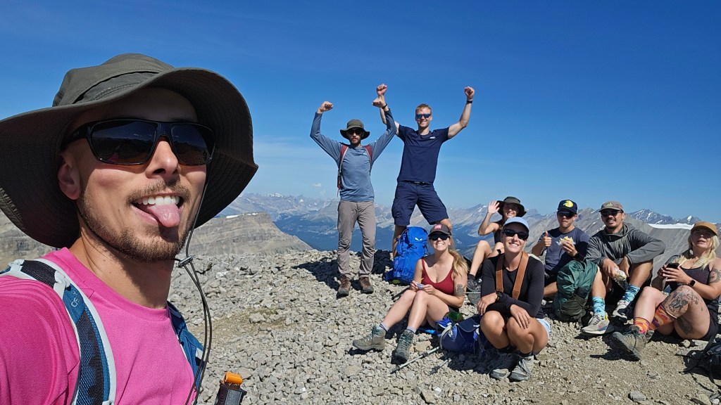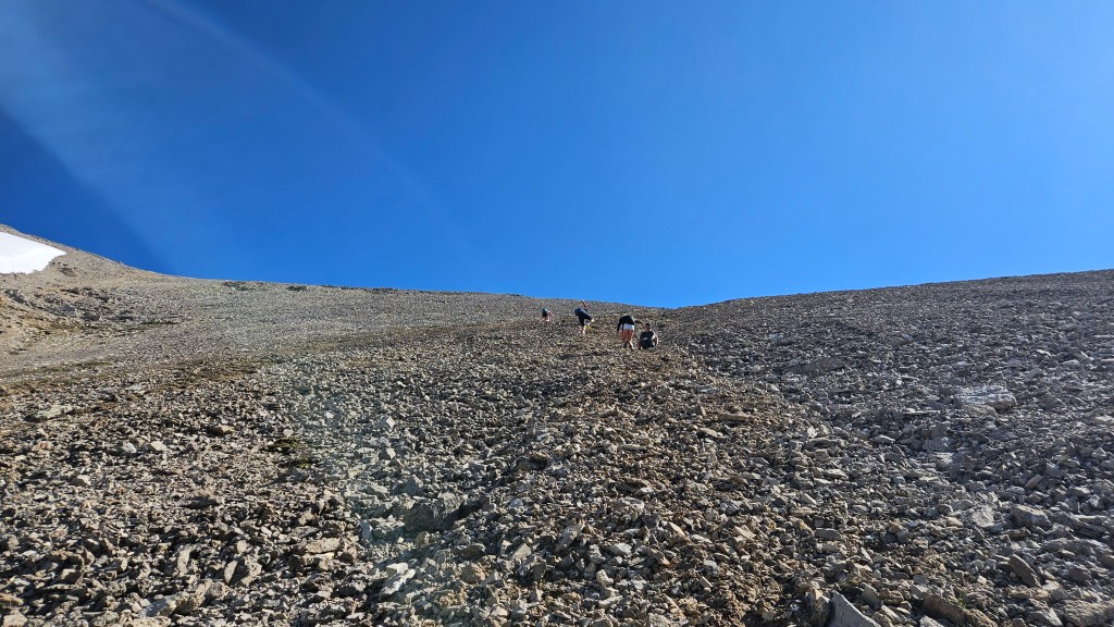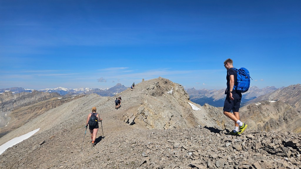 With talk of an “easy” objective on our radar that week, we attracted a lot of interest amongst our colleagues at work and ended up as another large group, nine in total. Everyone arrived at the carpark on time and we managed to start the hike by 6:23am. Even in those early hours we could feel it was going to be a hot muggy day with clear skies, and A LOT of bugs. The route is super straight forward following Parks Canada trails the whole way through Skoki to Deception Pass. From Deception Pass an unofficial but defined trail branches off eastward up Fossil’s western slope. It does get quite rubbly and steep in places making for some great photography along the way up, but isn’t really a scramble, more of a strenuous hike.