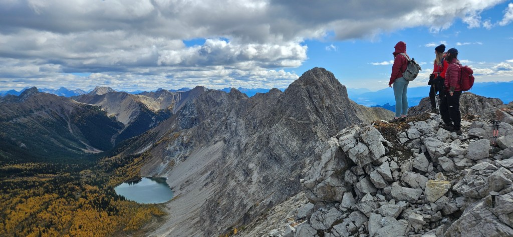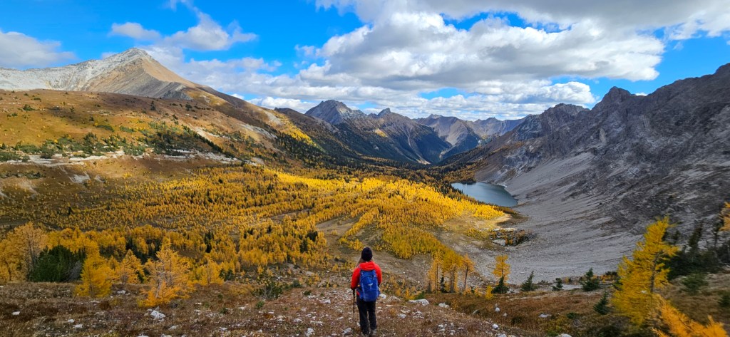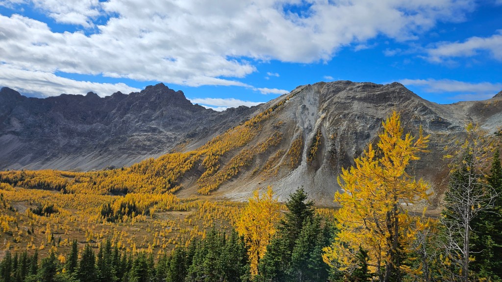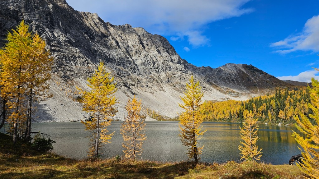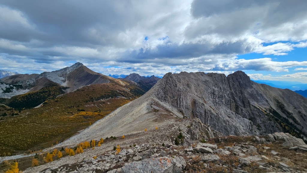 A fun return trip this past autumn to Diana Lake for the golden larches! Previously in 2022 Bri and I hiked up The Judge with a small team at the end of summer season and agreed it would be well worthwhile returning for larch season some day. The lodge owners shared some print photos with us that day of larch season and that had us sold on eventually returning. Plus, they mentioned that several of the nearby ridges were quite accessible, including the ridgeline north of the lake which they referred to as “Fossil Ridge” aptly named for the coral limestone specimens at the western end. Our traverse started at Whitetail Pass, traversing north then west, then briefly south before looping back to the lake.