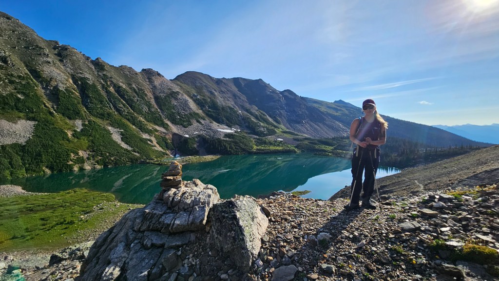 Between 3 vehicles we were a group of 7 plus one dog. Our group had an interesting mix of varying experience levels which in theory would make for a well-balanced crew. Gorman Lake’s FSR was in great shape at the end of the 2024 summer season and was still in decent condition that morning (most years 4×4 and high clearance is needed). Our group more or less all showed up on time and after chicken-wire-wrapping our vehicles kicked off the hike at 7:15am. Morale was high and this hike doubled as a scouting mission to assess the condition of the other Dogtooth peaks. With that in mind, we opted to take the south-shore trail around Gorman Lake to get a closer look at the ascent route for nearby Eos Peak. The trail was easy to follow though did involve a little bit of elevation gain/loss over and across a talus boulders towards the west end of the lake.