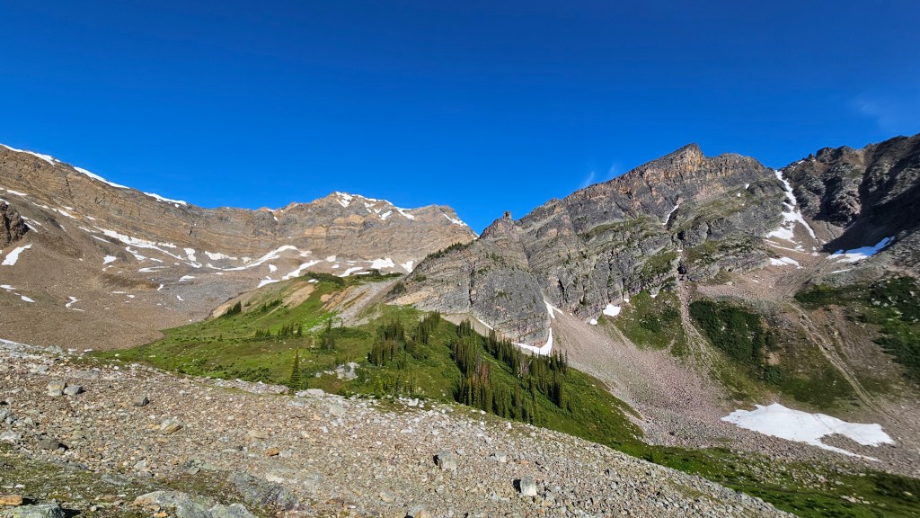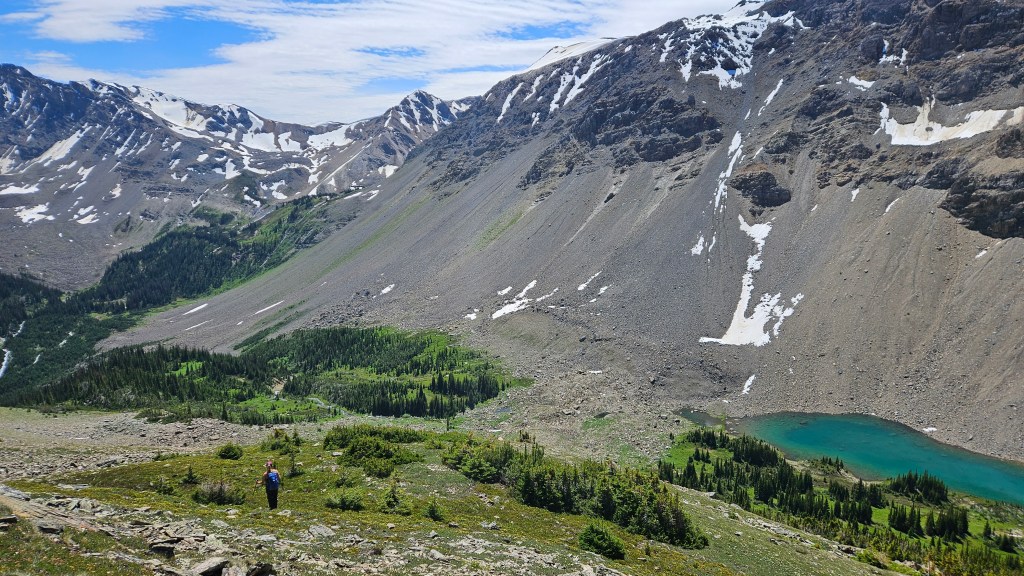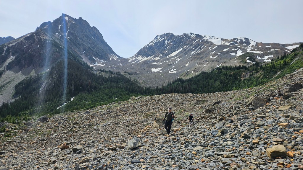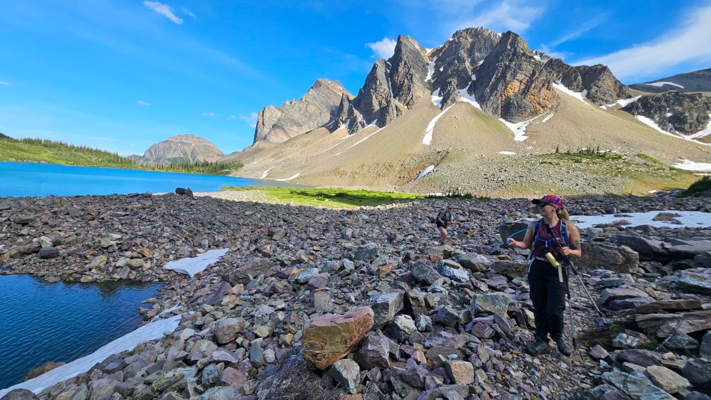 While enjoying the views, time briefly slipped away from us. It took a while for the last two members of our party to catch up and summit, and unfortunately they were limited to a brief visit. We had a long way to back track, including re-ascending the Bokor-Zombie Col which would add at least another 300m or more of vertical later into our day. We returned down to Lang Lake and fully regrouped one last time before splintering off into smaller groups for the return hike. It was here that the mood shifted and the stoke levels simmered down as everyone knew it was going to be a slog back up the moraine. And indeed, it was a slog.