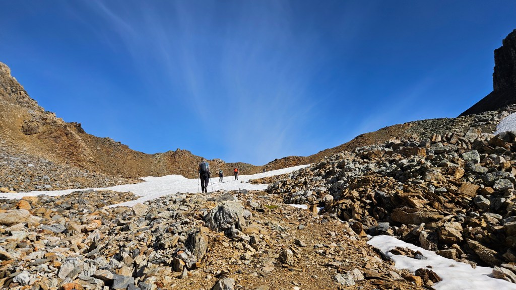 Navigating back to the moraine was straight forward enough, I had tracked our steps with my Garmin watch and had left flagging tape along the way. Although the group had split up we could still hear and call back to each other, which was very reassuring while in the trees. At the signpost we caught our last visual of the slower group and continued on our way. The toe of the moraine proved to be the “crux” of our day, being the steepest and shittiest section. Sharp talus and deteriorating silt made for troublesome footing and along the way our friend’s dog ended up with very bloody paws. We did managed to save ourselves some trouble and paw pain by boot packing up along the remaining snow patches to complete our ascent of the col.