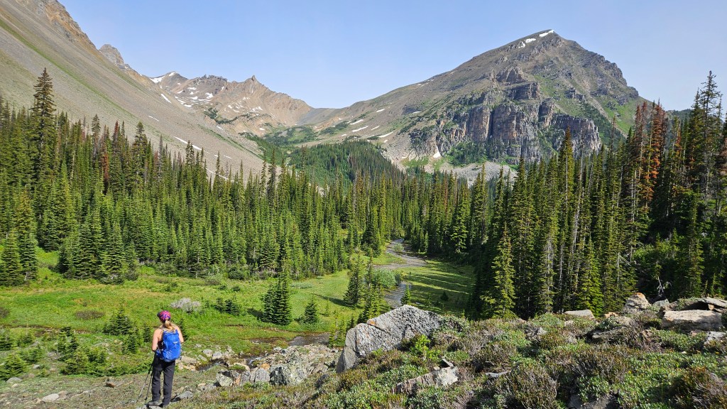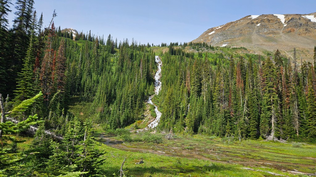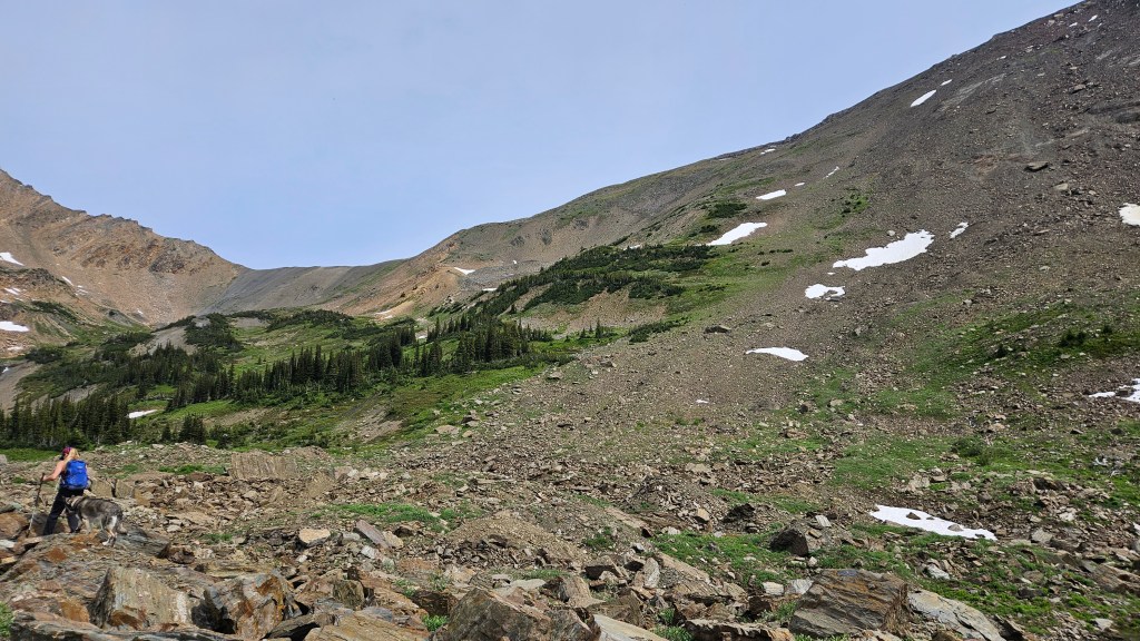 It was now heating up in the late morning sun and the bugs were waking up. We took a 10 minute breather to recharge and plan our approach across Lang Creek towards the base of Kingpin’s western slope. We could see most of the route to Kingpin and noted a rocky slope immediately (north) behind the nearest forest section. The creek itself appeared to veer east before linking up with Lang Creek’s northern fork; the creek’s banks were heavily forested and following them would undoubtedly lead to further elevation loss/regain. So, we decided to only follow the creek as far as lining ourselves up with the rocky slope on the northern side of the treed section, then cut straight across towards Lang Lake staying above the creek.
