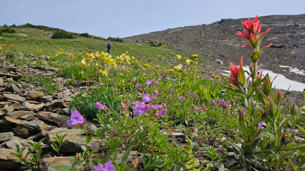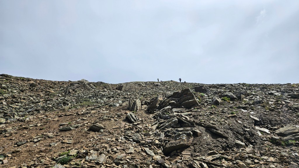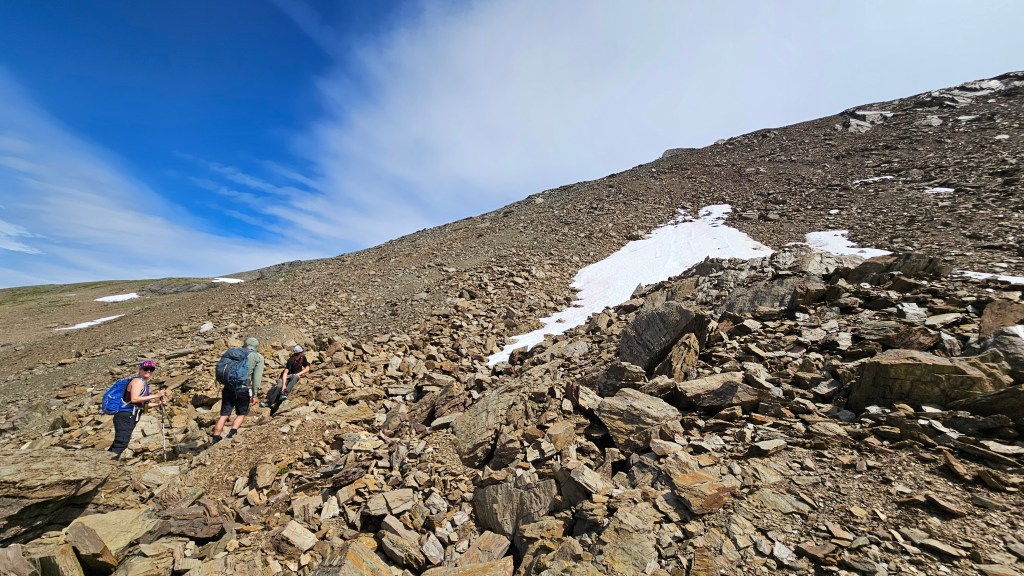 The rest of us started up the slope. It was now pushing 11:30am and the group was beginning to spread out with varying energy levels. Initially the slope was carpeted with alpine vegetation and meadow, with numerous summer flowers in full bloom. The meadows later gave way for classic talus and rubble, remaining non-technical in nature. Another plod for the books! One party member however strayed to the climber’s right into some very crumbly hands-on debris, oblivious to the deteriorating slope he stubbornly committed to it (moderate scrambling). The rest of us enjoyed the scenic walk to the summit with minimal difficulty.