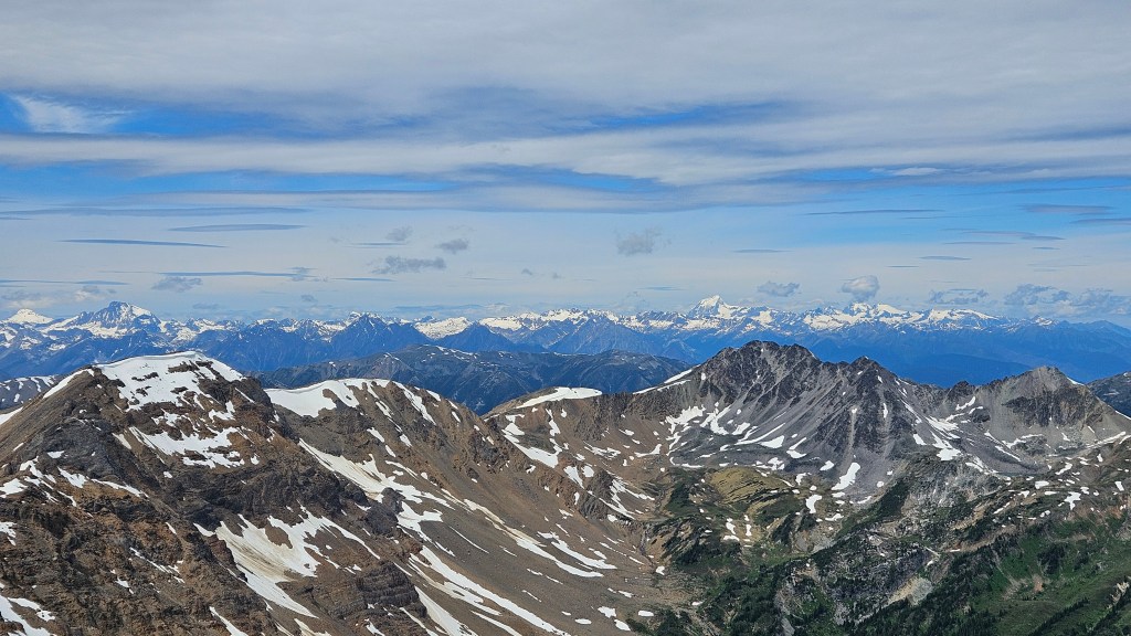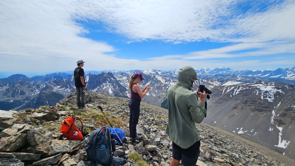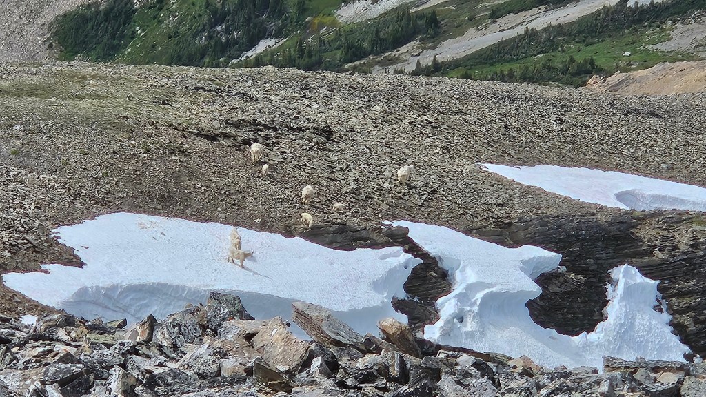 Most of our group made the summit around 1:10pm. And WOW what a summit indeed! Golden’s local peaks offer a lot of spectacular views but this may be the best we’ve seen yet. Views of the Northern Selkirks, Sir Sanford, Rogers Pass, Blackwater Range, Van Horne Range and beyond greeted us at the summit. The morning’s blue bird conditions held with the only minor obstruction being a patch of wildfire haze to the far south. While waiting for the the last two members of our summit party to catch up, the four of us watched a large family of mountain goats lapping up snow melt just below the main summit’s northern slope. In terms of summit views, this might be my favorite from the 2025 season and there were many grand views that summer!