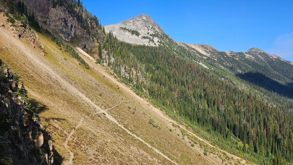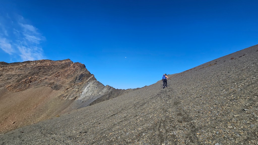 Retracing our exact steps from 2023 Scott took us along a hiking trail that parallels above the Certainty Mine trail, travelling westward past the waterfall. The trail is narrow but well defined, and easy to follow even as it crosses a couple steep scree slopes. Past the scree slopes the route contours northward up Springer Saddle, a broad gradual hump that sits above the north fork of Twelve Mile Creek and McLean Creek. We noticed several sets of tire tracks in the scree to which Scott informed us that this is a popular heli-bike area.
