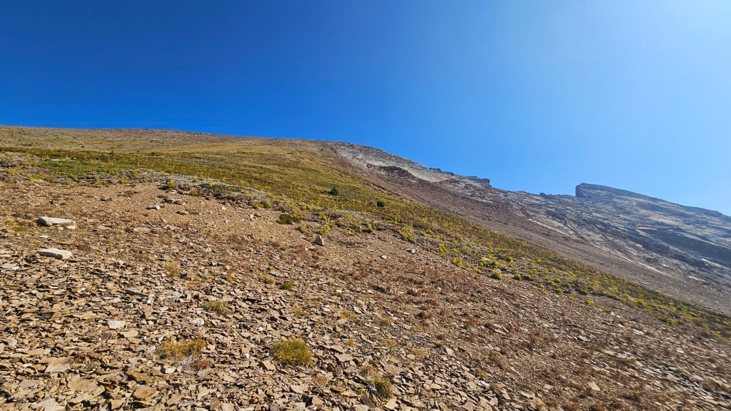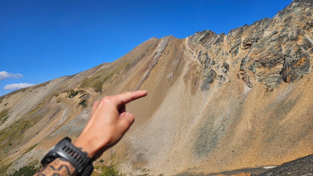 From the Springer saddle we descended north into the bowl above McLean Creek and scrambled up the opposite (northeast) side as to gain a mellow west slope. This slope provided a direct line up to the summit, which is quite obvious once standing underneath it. We stayed slightly to the climber’s right (east) of the trees. The alternative would be to scramble along LSD’s south ridge from Springer saddle which is more direct however looks very exposed and technical. We had 3 dogs with us that day so stuck with the tamer west-slope option, even if it did cost us a few hundred meters of elevation loss and regain along the way. Our route was more of a hiking route and less-so a scramble with no technicalities just treadmill scree bashing in spots. In fact, the access trail felt more scrambly in spots than the peak itself!
