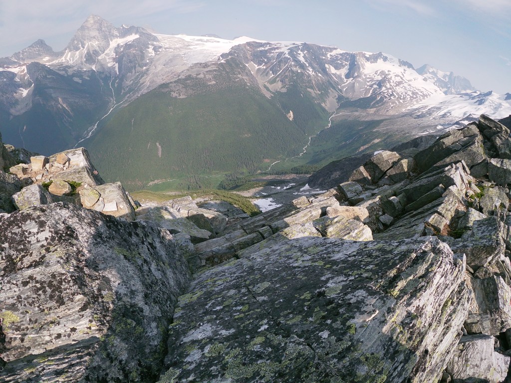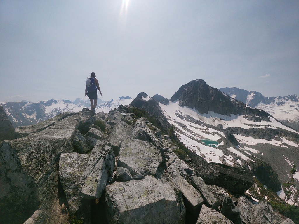 Follow the popular Parks Canada hiking trail up Abbott Ridge, some 4.9km via switch backs through old growth interior rainforest and eventually past Marion Lake into alpine meadow. The trail switches back several more times eventually leading you past the shoulder (looker’s) right and onto the start of Abbott Ridge. Allow 2 – 2.5 hours for this initial approach from parking lot to the Parks Canada trail marker indicting that the trail has ended. Continue past the Trail Ends sign and traverse the ridge south towards the summit of Mount Abbott, an easy/moderate scramble. You are no longer on the official Parks Canada trail and are now into easy scrambling terrain with sustained but manageable exposure.