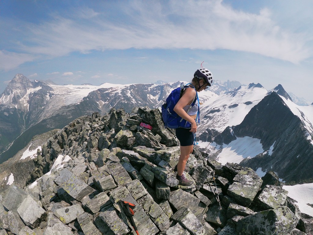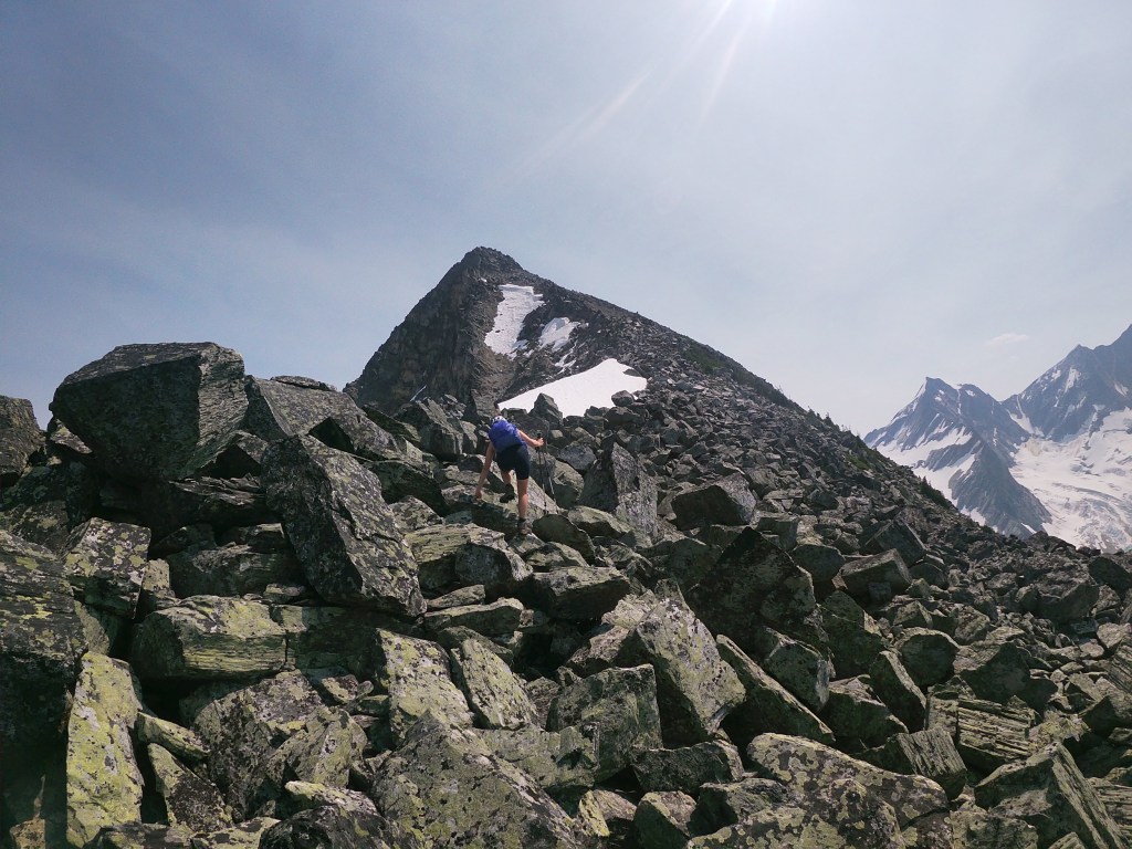 The last section is the most hands on part of the day but is no more technical than moderate levelled scrambling as encountered on the route. Bri lead the charge more or less straight up the block, whereas I contoured slightly to the climber’s right, taking me to a ledge on the southwestern corner of the lower summit block; from there it was a straight push upwards on solid but exposed rock. Bri’s way was the faster of the two.