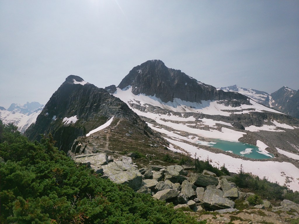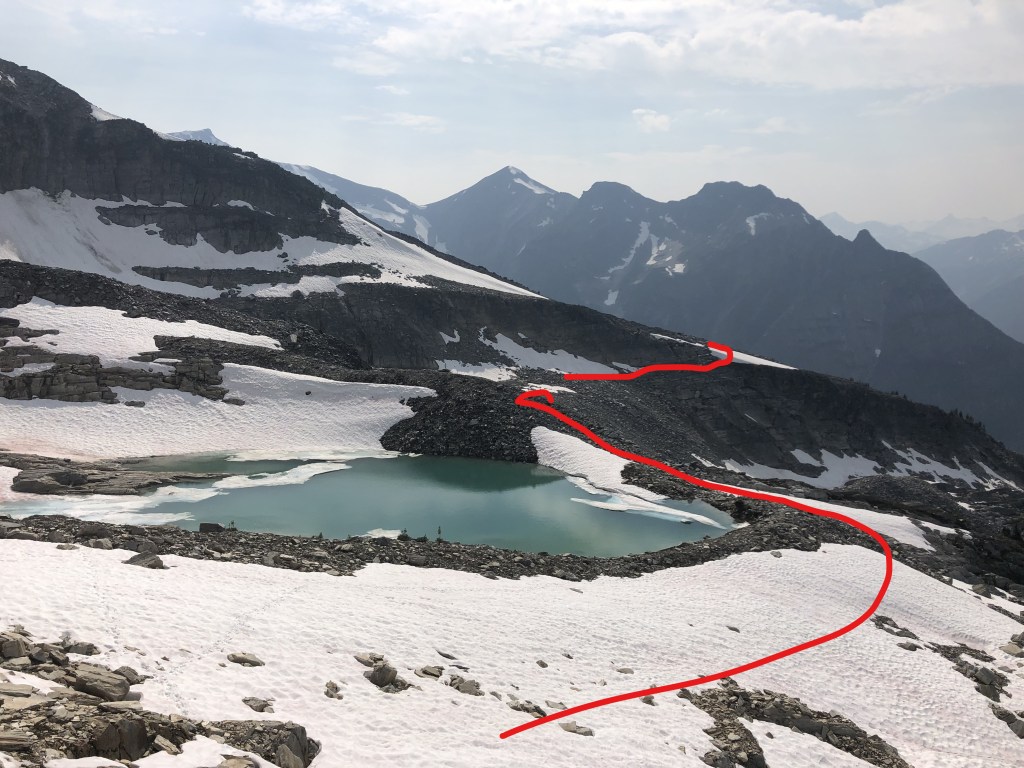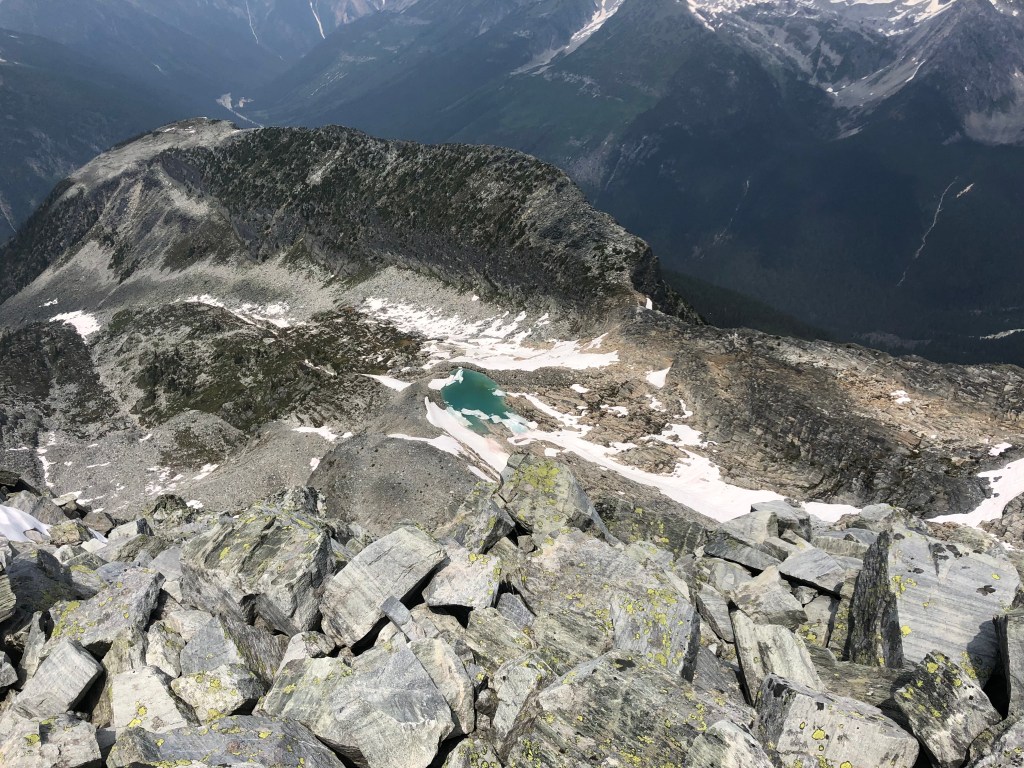 We stuck to the same route for our descent. For the descent aim slightly to the skier’s left (west) as to avoid the more exposed sections of the ridge crest until you reach the bottom north shoulder above the tarn. You have to complete a natural switch back from the grassier section of the shoulder and switch onto a gentle graded ledge, this will lead you back towards the moraine that sits below the tarn. A brief 25-30m scramble up easy boulders will bring you back to the tarn itself, from there you can easily ascend back to Abbott Ridge. For those wanting both peaks, Mount Abbott is only a few more minutes away scrambling south over large blocky boulders. Otherwise, head back north along Abbott Ridge until you’ve returned to the formal Parks Canada trail.