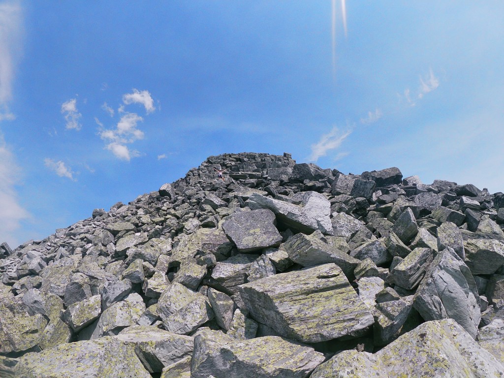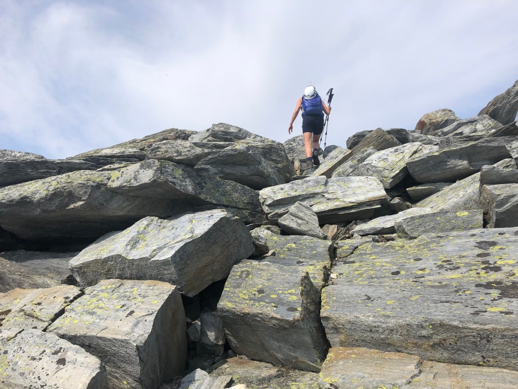 Once you’ve gained the shoulder above the ledge, work your away up the ridge crest, gradually working your way to the climber’s right hand (southwest) side as to avoid the more exposed sections. Several of the boulders along the ridge crest balance over deep air pockets through here so mind your step and don’t drop anything in (including yourself)! Expect sustained moderate scrambling as you gain elevation, though most of the hands on parts are in the form of boulder hopping. Continue along the ridge crest until approx. 80m beneath the summit when you’ll want to venture slightly to the climber’s right to avoid the more exposed sections, slogging up hard packed scree sections between boulder patches.