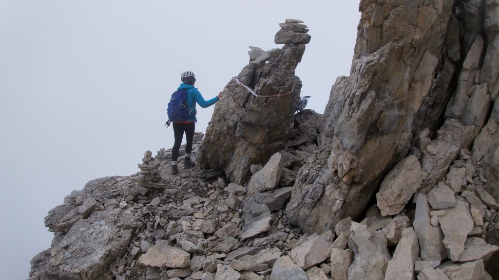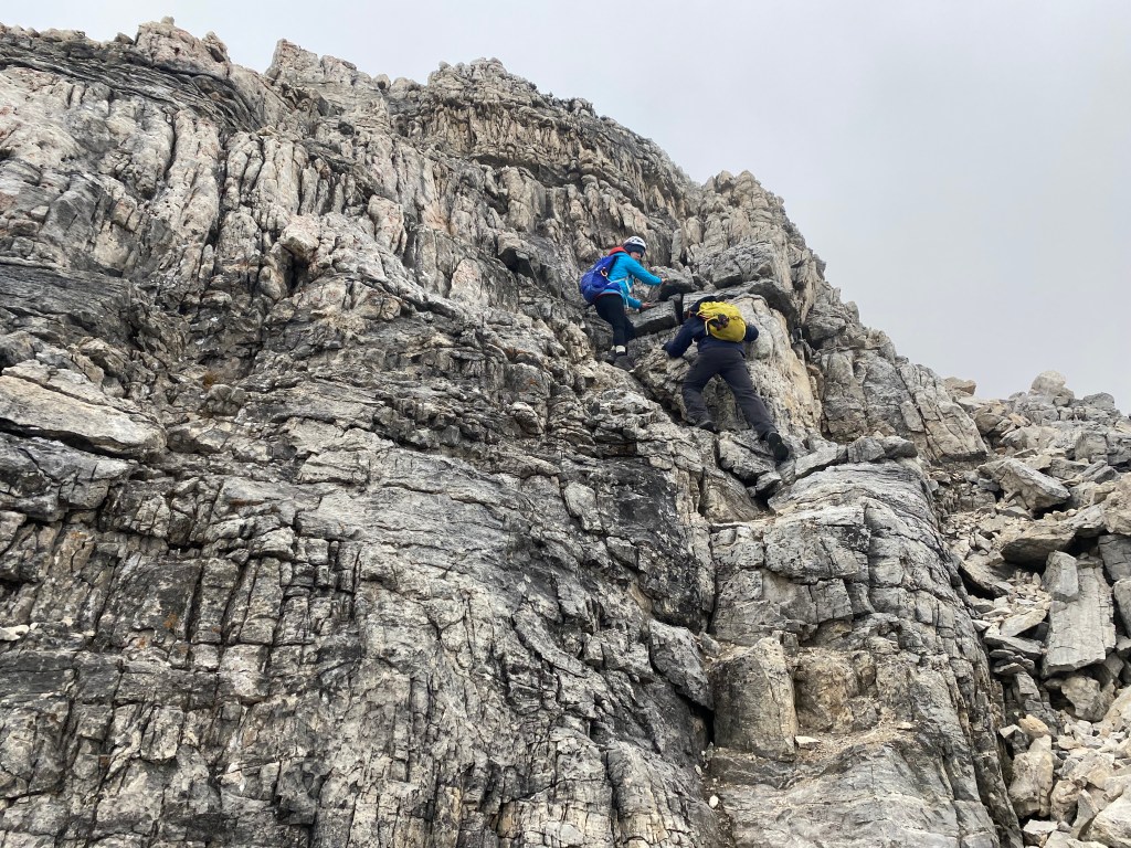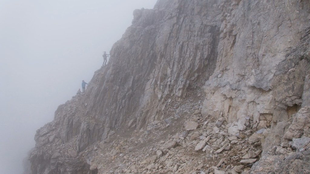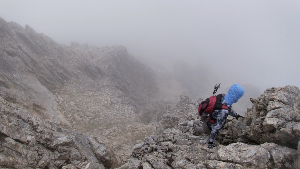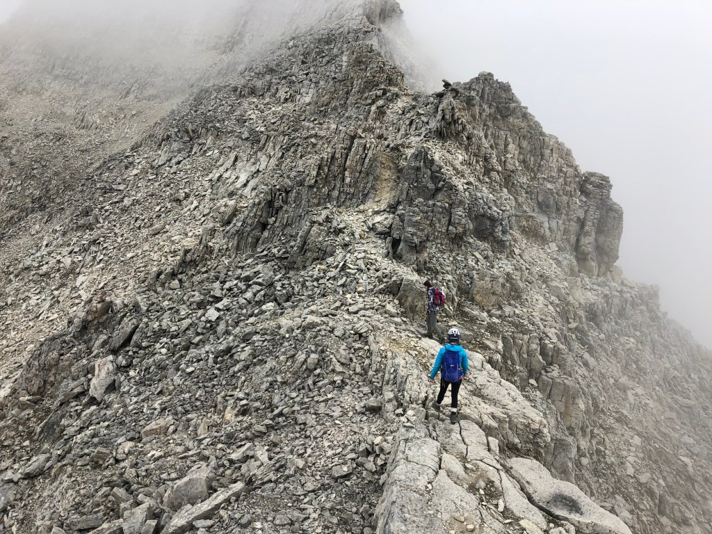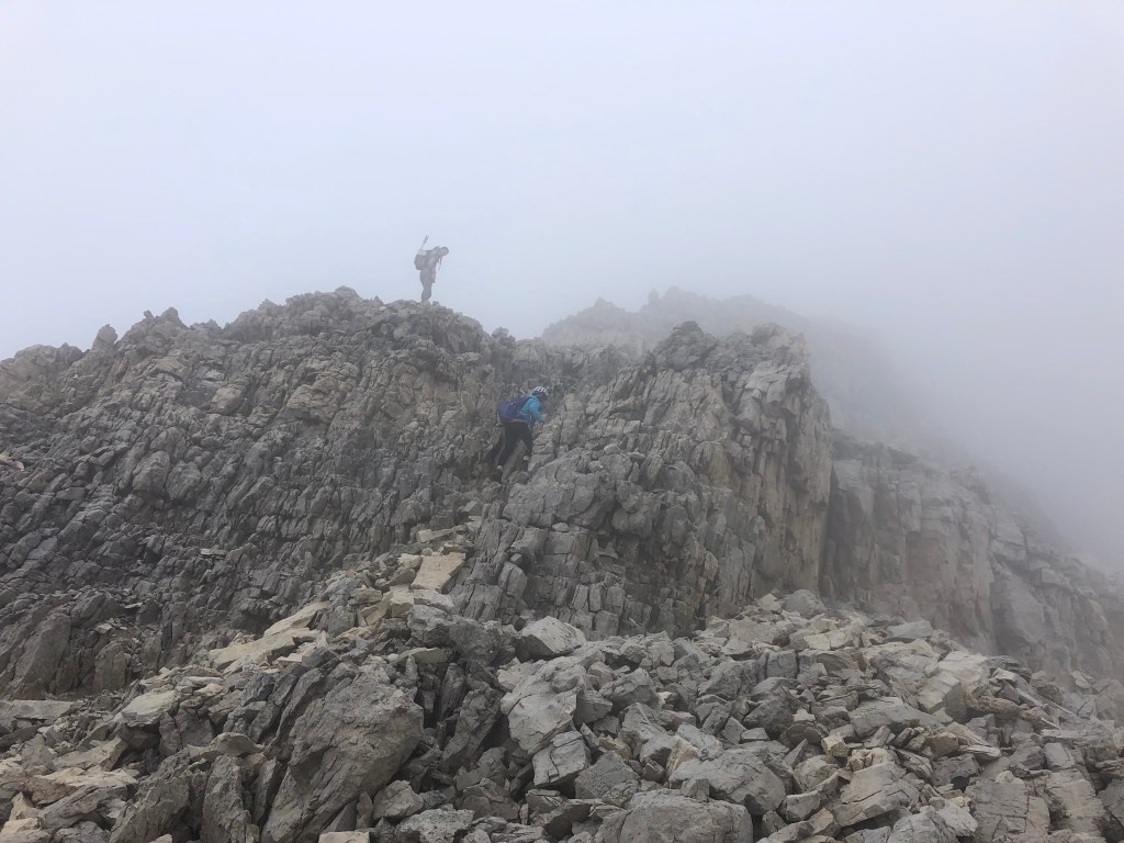 We encountered easy to moderate hands-on sections with select moments of exposure. Generally we stuck to the ridge itself, though on several occasions had to detour to the climber’s left and scramble up littered ledges. More than once we prematurely assumed we had reached the crux, a lingering cloud over the summit obscuring our view of the route above. For the final 300m of the ascent we were truly in the fog and visibility limited to about 10-15m in spots.