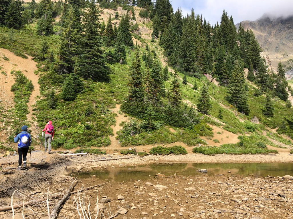 First, one must endure the two hours worth of switchbacks leading up from the Emerald Lake parking lot to Hamilton Lake. There is no real trick to these other than determination and energy, and Hamilton Lake itself provides a good spot for a much-needed breather. On this particular visit, I noticed that the water levels were substantially lower compared to my previous visits in 2015 and 2018. Likely this was due to the extremely hot summer in 2021. We managed to time this trip with when the wildfire smoke briefly clearing from the area, though the summit remained in a cloud for the entirety of our trip. This outing had already been postponed by our group multiple times that summer, so on August 9th we decided to go for it despite the low likelihood of a summit view.