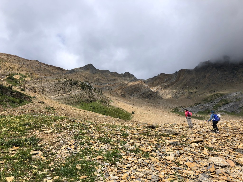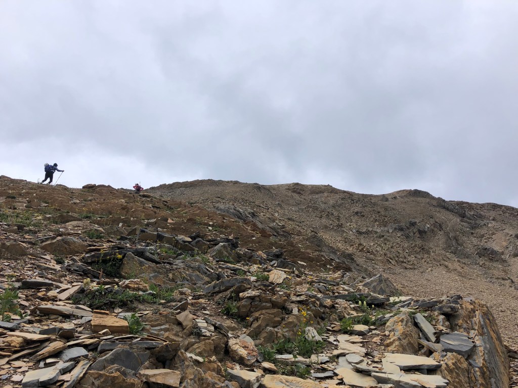 I had briefly attempted toiling up a steep pitch immediately left of the flagging, following a different set of cairns. The route I went less then ideal: while the angled grade was gentler, the ledges above me were extremely narrow and heavily littered with shale. Tash and Bri’s route was steeper by comparison but looked cleaner. I had to briefly downclimb the area I had attempted and traverse over a narrow exposed ledge to catch up to where the girls had chosen to ascend.