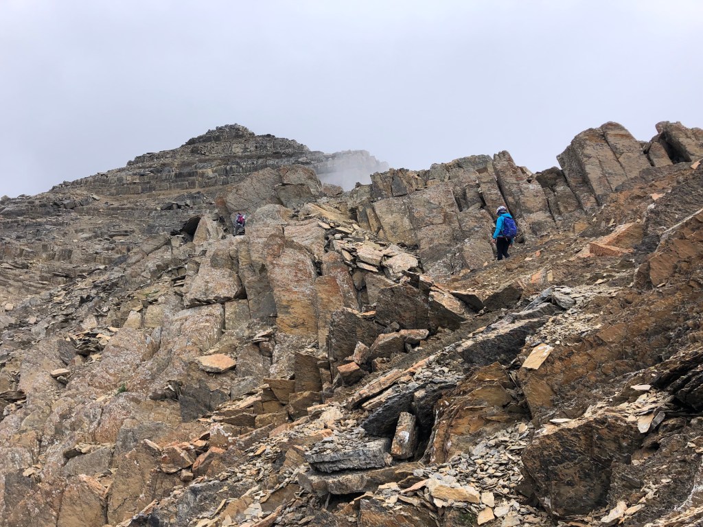 Once above the worst of it, we examined the route back down making notes for the return journey. We kicked down a few of the unnecessary cairns here, as there were far too many in this area, most being false leads to wickedly steep ledges. It definitely reminded me of the upper sections on Mount Whyte in Lake Louise. The cloud coverage, if anything, helped hide the very real exposure of this area giving us a confidence boost with the up-climb.