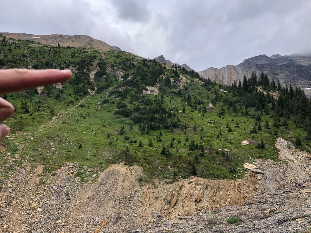 While downclimbing some of the steeper ledges of the ridge around 2750-2700m Bri slipped off a ledge, thankfully she avoided any serious injuries and was able to continue unassisted after a brief break. Having knocked down some false-lead-cairns earlier on the way up, our downclimb was somewhat more straightforward in terms of route finding. Once below the clouds things sped up and once back to the shoulder above Hamilton Lake, we decided to hike down a narrow slide path previously spotted on the hike to Hamilton Lake. I’m not convinced it saved us any time, but in taking this alternative route we spotted a mountain goat and picked up some rubbish left behind by past scramblers.