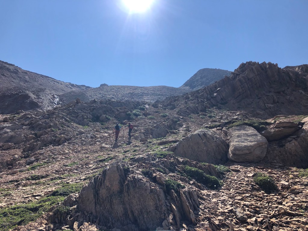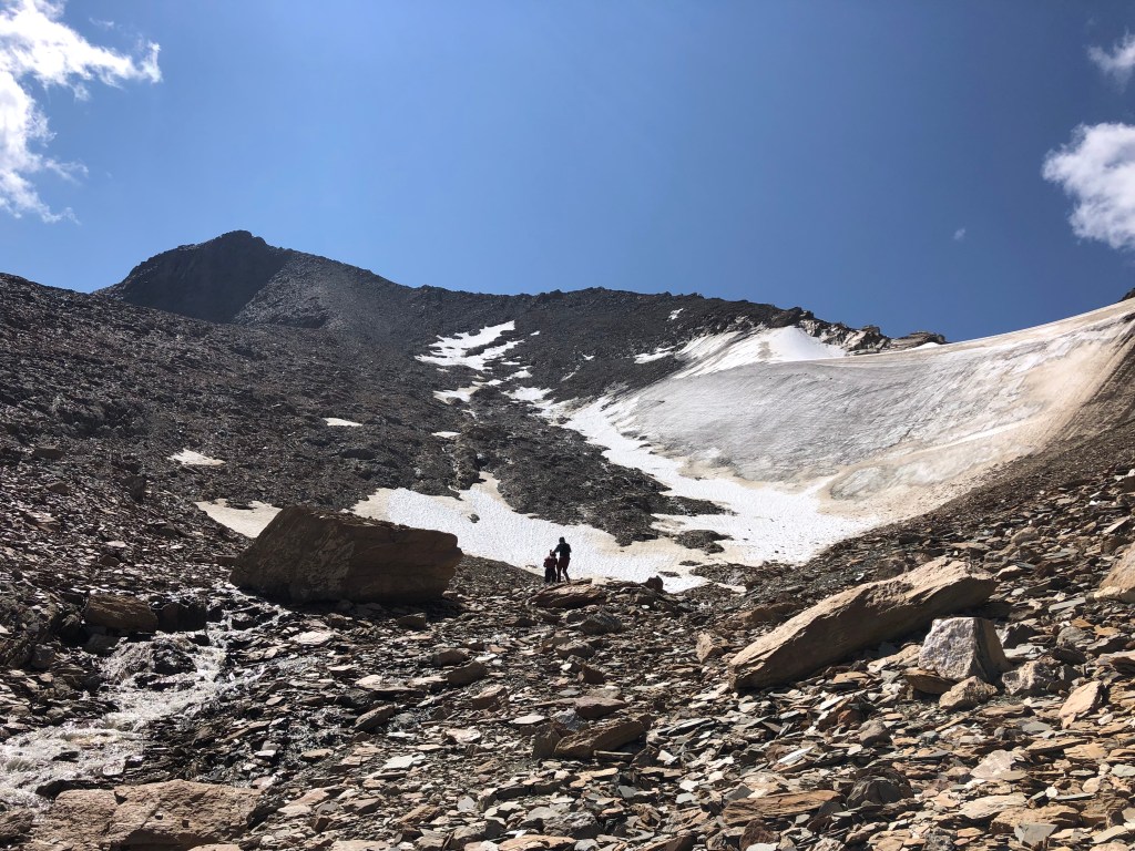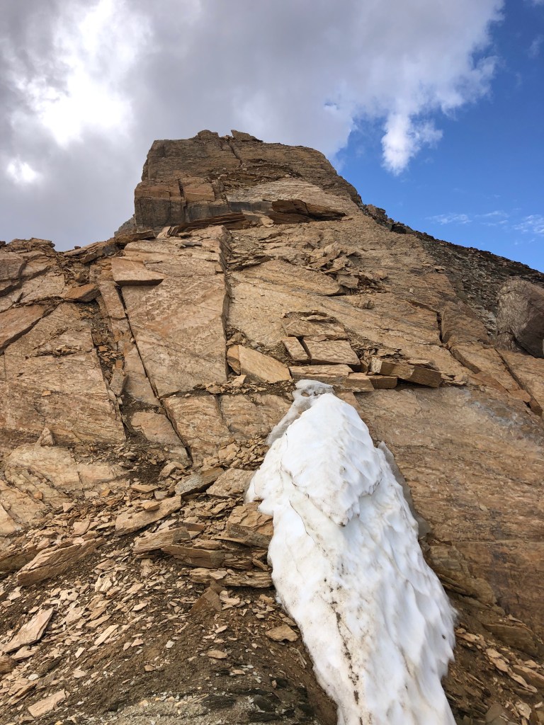 From the lower scrubby ledges, we continued up a steep rocky terrain into the basin that feeds the creek system. Loose crumby talus galore! Below the Redburn-McBeath col the terrain briefly mellows out into a bowl. Rather than scramble up through the bowl to the col (which was an option), we turned sharply to our right and went straight up eventually encountering a small remnant glacier. Well under the glacier portion of the slope we veered slightly northeast towards the edge of the talus slope aiming right for the false summit. Luke and Scott’s GPSs showed conflicting points for McBeath’s summit and there was brief speculation that the false summit could be the high point.