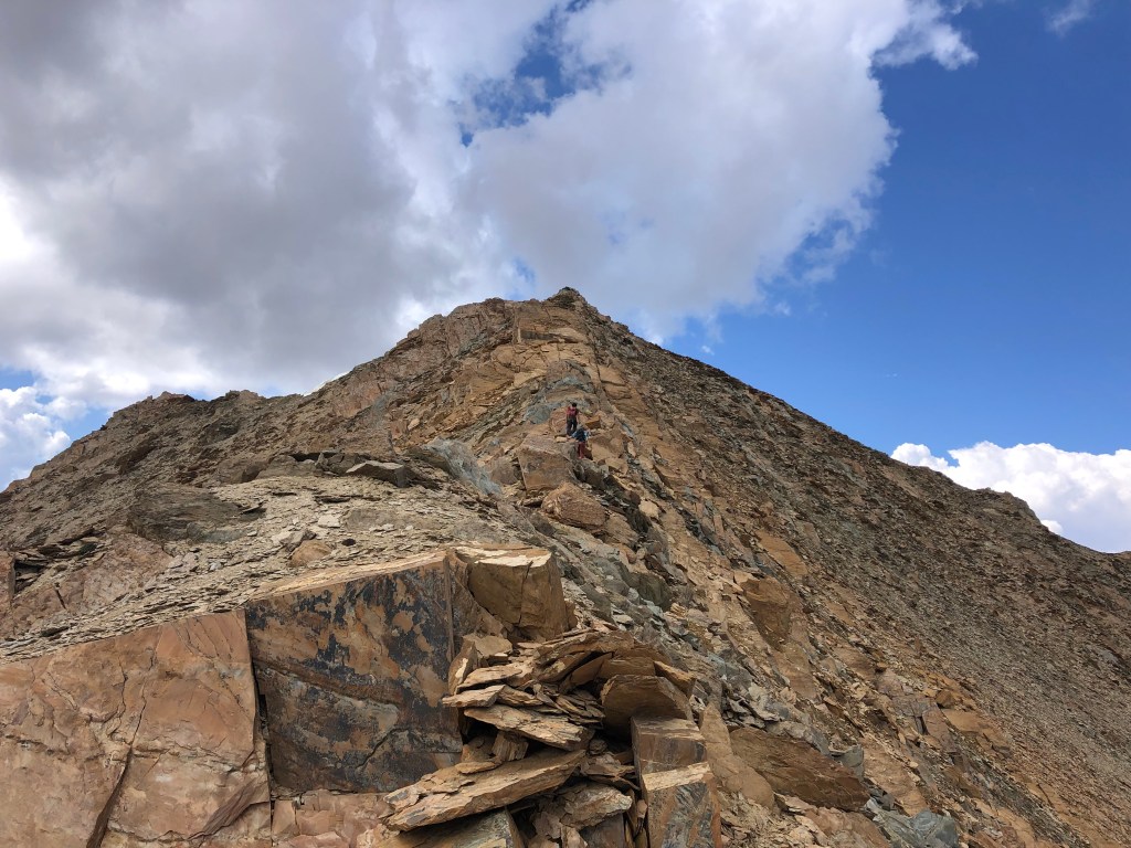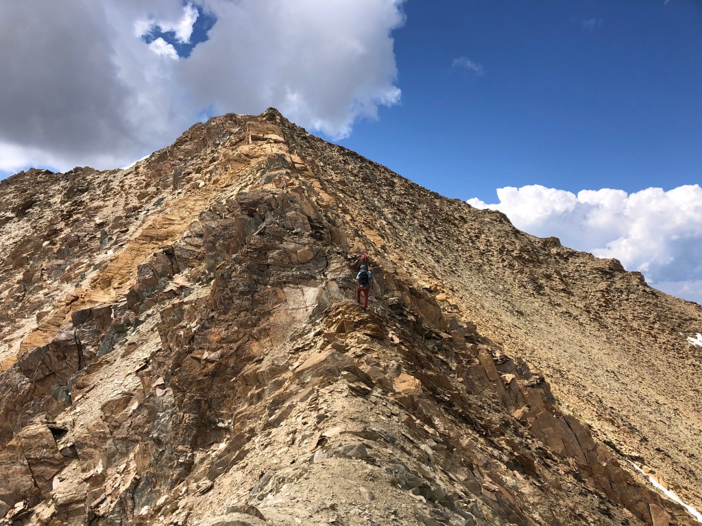 Turns out the false summit was indeed just that, a false summit. A higher point further southwest along the ridge was plainly our objective. We double checked our maps and GPSs anyways, and confirmed we had roughly another 150m of vertical to gain. So, we continued along the ridge southwards. The ridge was wide enough at the beginning but eventually tapered into narrow blocky sections providing us with moderate scrambling.