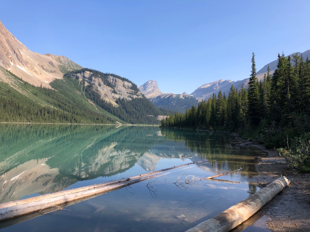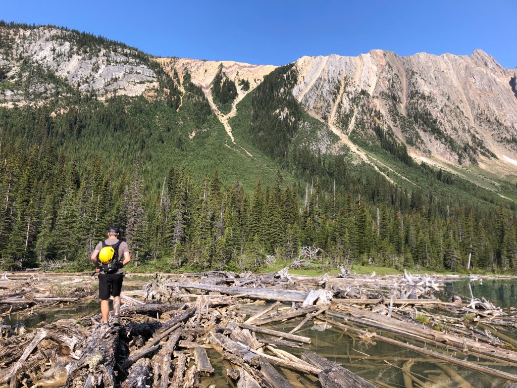 One silver lining on the downclimb was we travelled the Y gully all the way back to the shoreline, to our delight there was some flagging and minimal bushwhacking compared to what we experienced earlier that day. While hiking back towards the log jam, we noted that while cairned and flagged, this exact entry/exit point is hard to pinpoint from shoreline, and as noted on the way up is around a very blind corner. If one can locate it, one can avoid the nasty bushwhack we did. Another note is Scotty & Benny have done Ogden direct from the highway via a goat path that involves minimal bushwhacking and is well flagged. I vote go up from the highway to those reading this! Had it not been for the bushwhack and Y gully, the ridgeline and summit block portions of the day would qualify Ogden for one of my favourite Yoho scrambles.