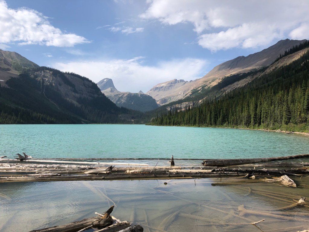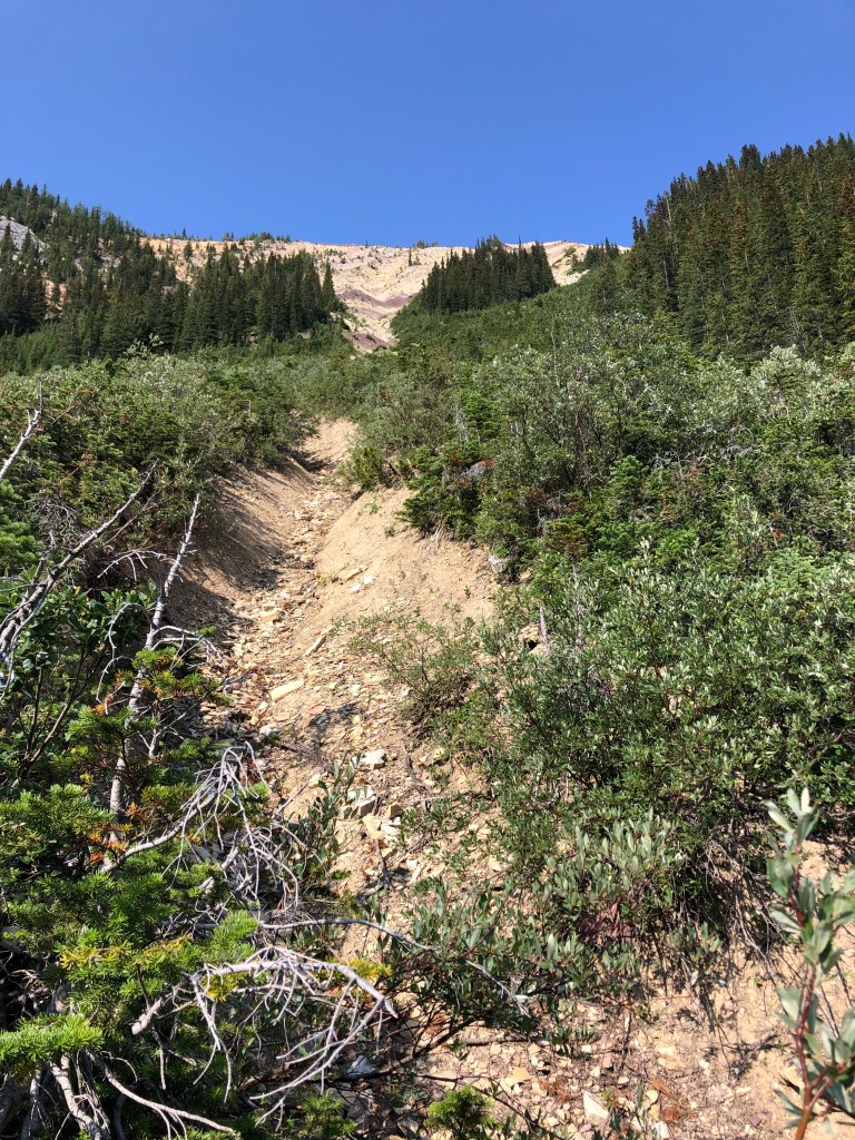 There are two approaches that can be used for this peak, one is directly from the highway (the pull-off is subject to seasonal wildlife closures in spring and early summer), the second is via Sherbrooke Lake. We went the Sherbrooke Lake route, once at the lake we crossed the log jam aiming for a Y shaped avalanche path as per Kane’s (2016) description in Scrambles. The Y shaped gulley is notable for the purple-tinted scree bands rippled across the top of the gullies: we aimed for the upper right arm of the Y. As for the bottom of the Y shape, we decided to bushwhack straight up from the shoreline after spotting a brief clearing.