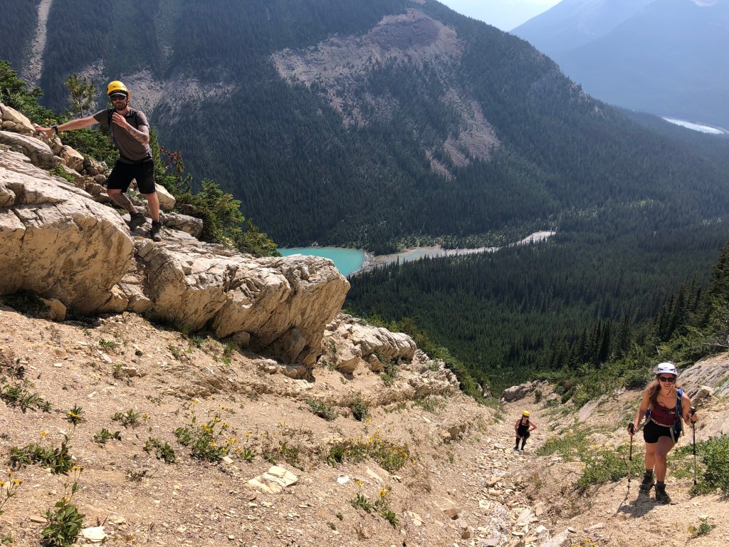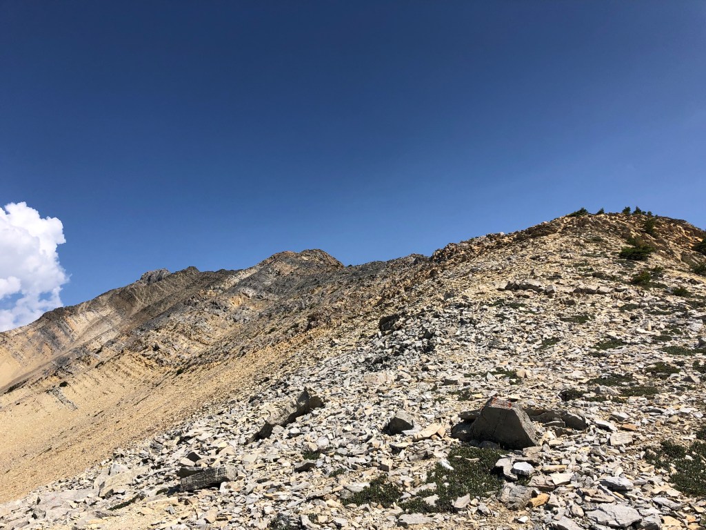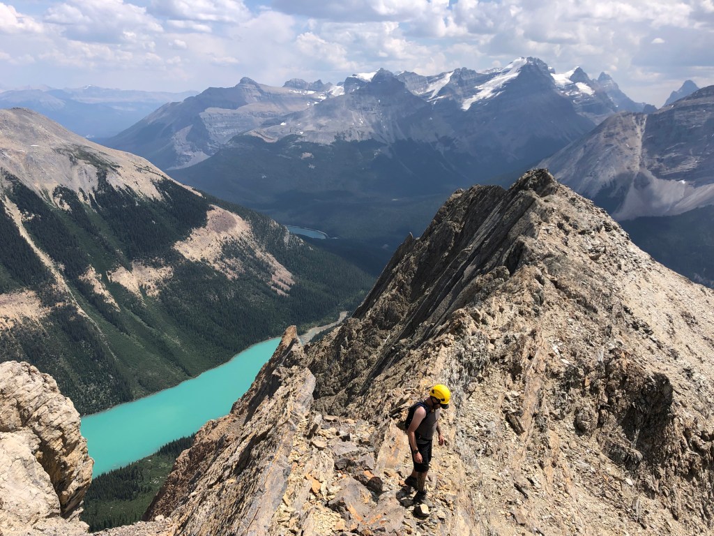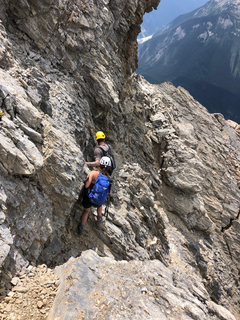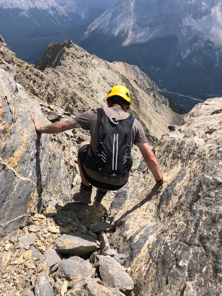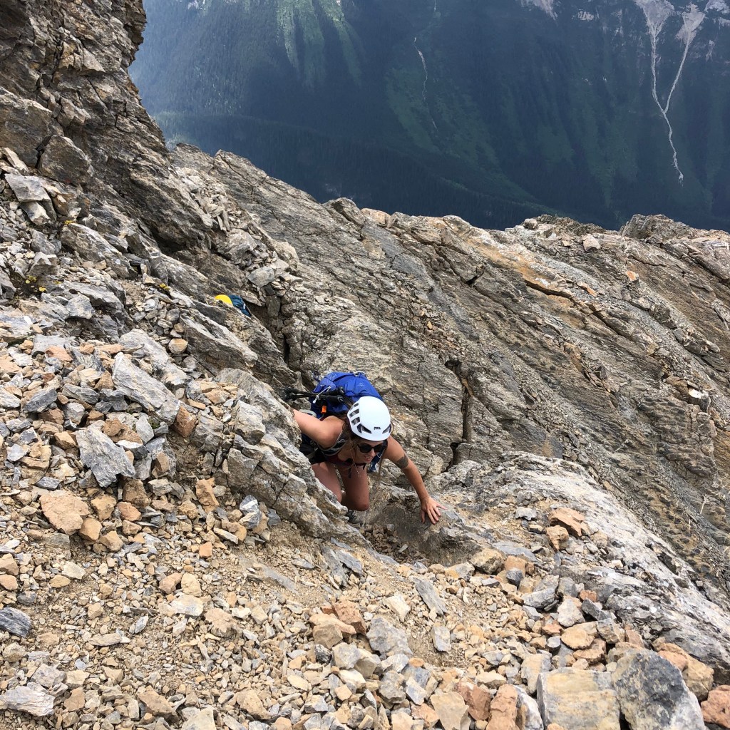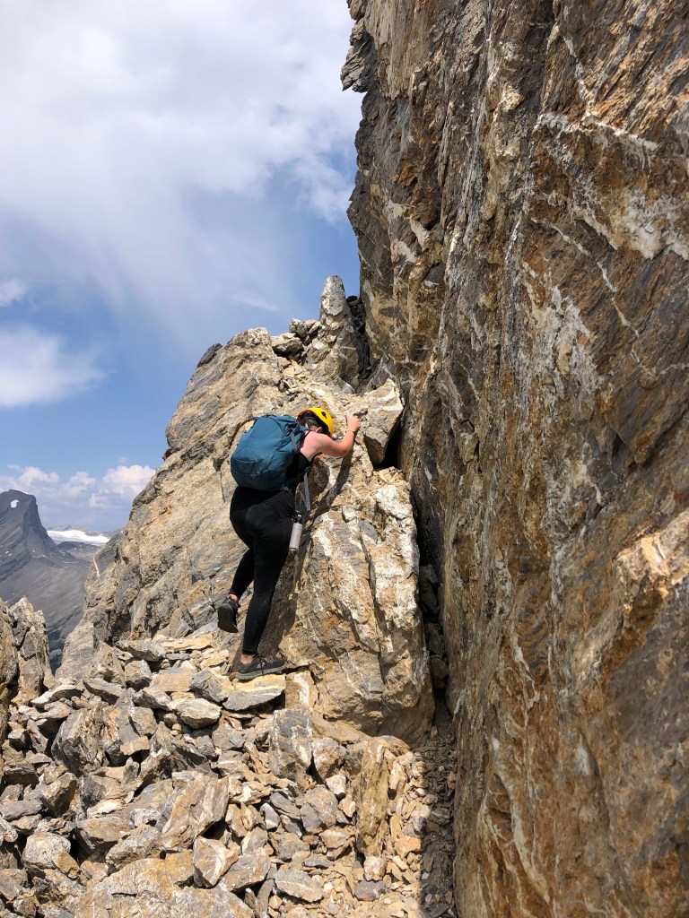 The downclimb of the crux proved a little more daunting as the exposure was much more apparent, and we worked well as a team showing each other the critical steps necessary for safely scrambling back to the more protected ledges on the mountain’s western crest. Once back onto the main ridgeline and the summit block in our rear view, the scrambling mellowed out and the views of Cathedral Mountain and Mount Stephen kept our spirits high as we traversed south back to the Y gully. Another gully just north of the Y shaped one appeared as a possible alternative downwards, we stuck to the original gully and suffered the hardpacked silt on descent. It was too hard to boot-ski down and too steep to run so we plodded and picked our way down – Aoife was less than stoked to be in the gully again.