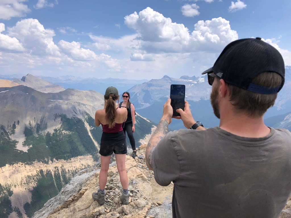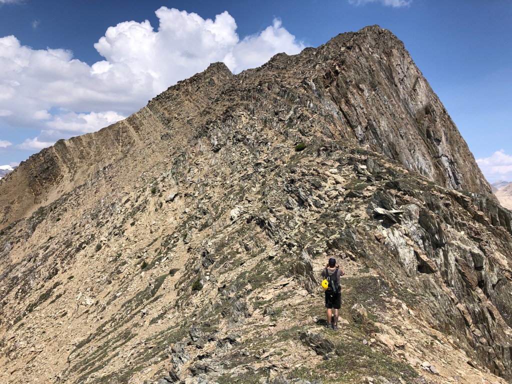 Once the summit block was within grasp, the path lead us briefly down the west side away from the ridge crest across a series of very steep ledges and thin gully’s – the scrambling still felt moderate in nature but we were all very aware of the increased falling exposure. Up until this point there had been a well travelled foot path leading us across the ridge, and while that path had mostly vanished now, there were still a fair few cairns that helped us through. Some route finding was required navigating the summit block, which is where the difficult scrambling began. We scrambled upwards through 3rd class terrain and then wrapped around the back (north) side of the summit block. Here lies the crux. A tight down-sloped ledge that feeds into short but awkward step somewhat resembling an hourglass shape. Holds were plentiful however the exposure through here is scary steep – a fall from here would certainly be fatal. We took our time through here and carefully picked out the sturdier holds ensuing that everyone summited. Above the crux was the flat relief of the spacious summit. We enjoyed a decent break, and like most peaks in 2023 began our downclimb when dark clouds threatened to roll in (thankfully this time, no storms).