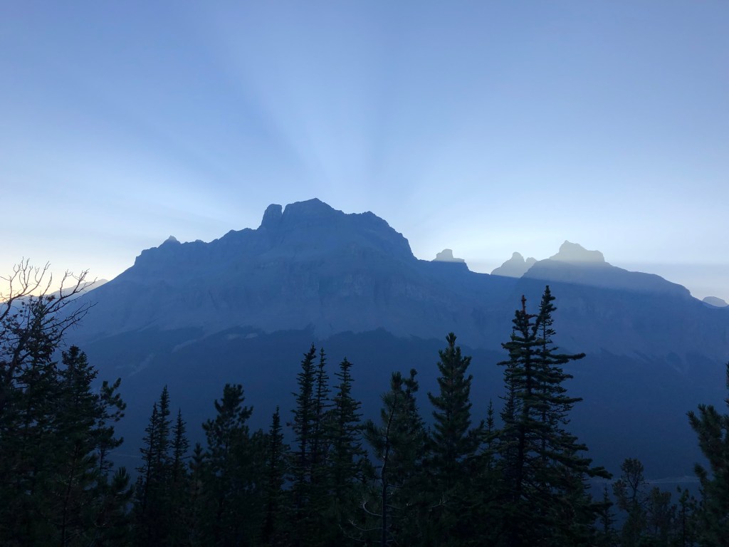 After a brief overnight in the car, we started out from the Mistaya Canyon carpark at 6am following the Sarbach Lookout trail. It was a cold dark start that morning, and as we neared the old lookout the sky brightened up and showed signs of becoming a clear mostly-smoke-free-day. We reached the old fire lookout around 7:50am, and would reach the lower ridge crest in another hour from from the lookout.