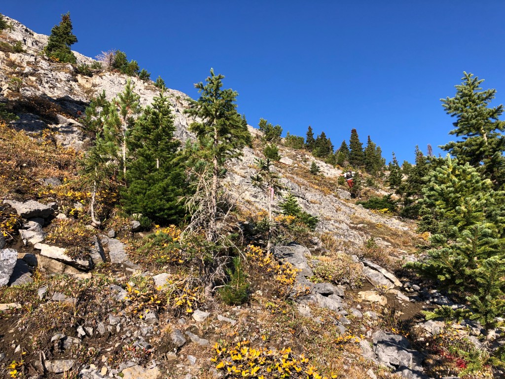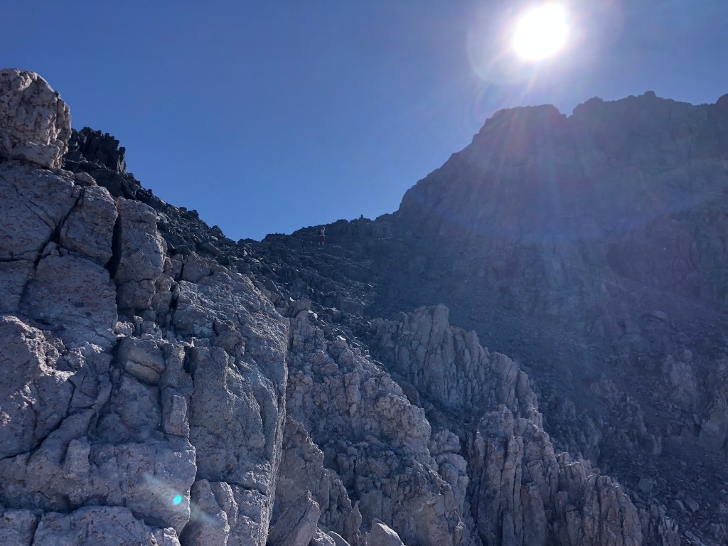 Crossing the summit ridge crux on return was as challenging as on the way in, again a very brief (under 5 minutes) but daunting scramble. Following the ridge crest back towards the false summit the footpath was plainly defined and easy to follow. We followed the ridge crest until nearing the false summit, and then downclimbed a gully near the overhang feature observed earlier. As we downclimbed the false summit’s lower slope and hiked back along the plateau-like portion of the ridge, we saw that another party was stopped above the second notch and feared that there could be trouble. Turns out there wasn’t any, they had just picked a very inconsiderate spot to stop for the day and hangout.