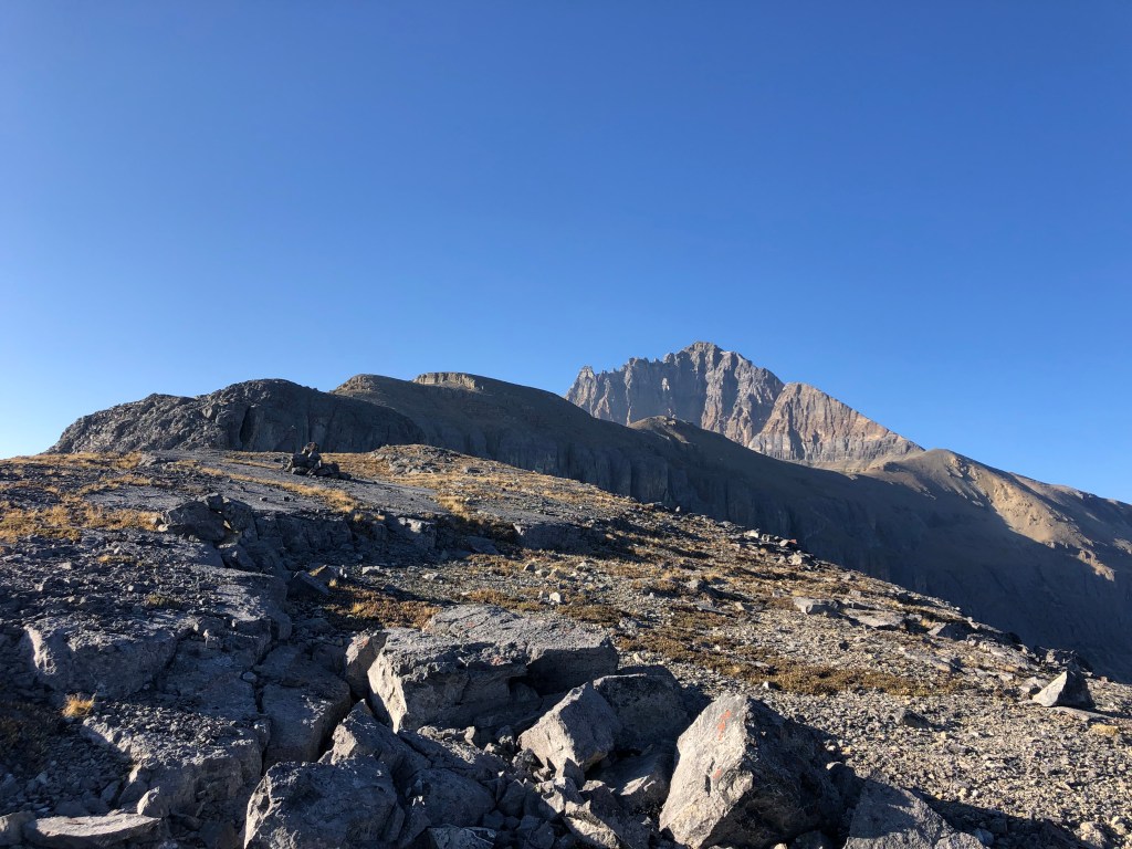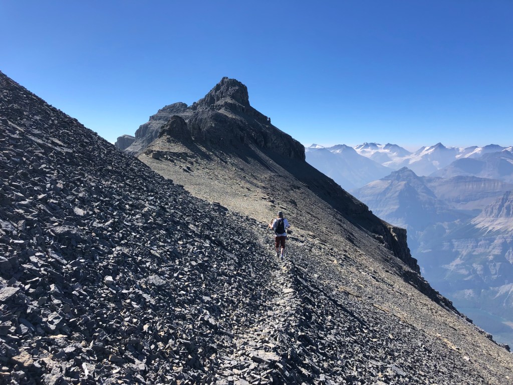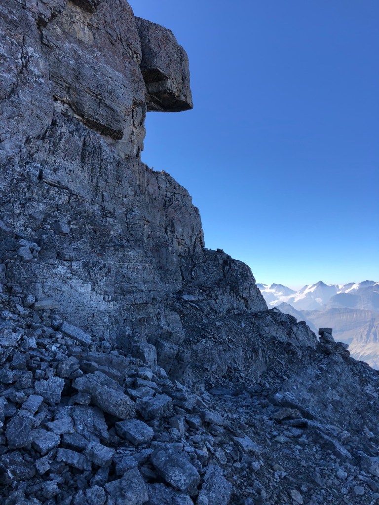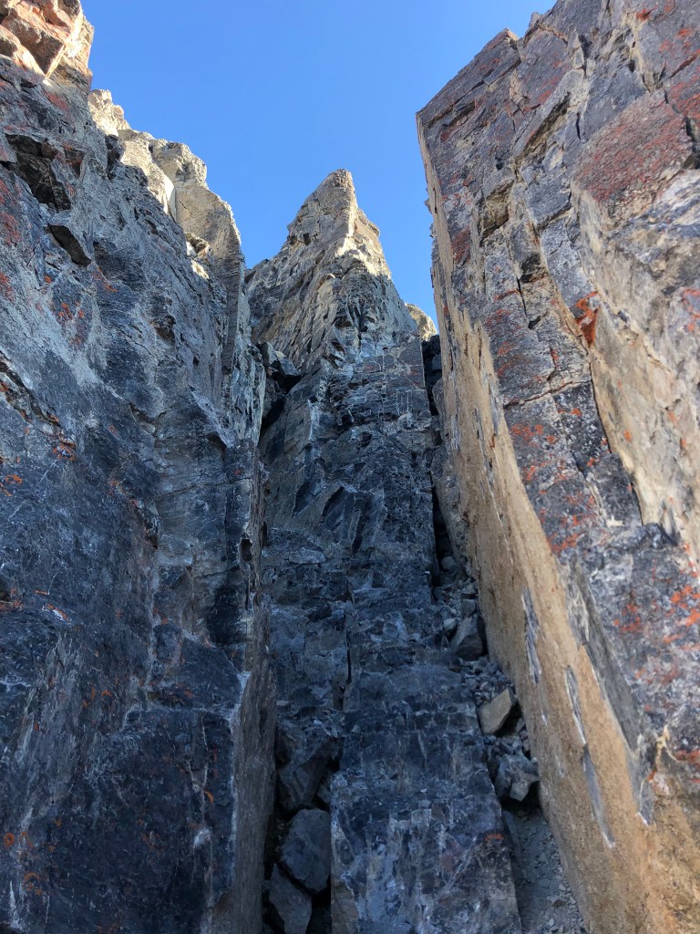 It would still be another 3 hours from the second notch before we reached the true summit that day, making this first crux our halfway point. After the second notch there is a brief easy-moderate scramble leading to a broad flat “plateau” portion of the ridge, which felt like a gentle stroll in comparison to everything else that day! Eventually the gentle-wide-flat ridge steepens and angles southwards up a rubbly slope towards the false summit (moderate scrambling). From underneath the block of the false summit there are two options for continuing. One can do as we did and stay under the false summit traversing across an exposed ledge that leads almost to the true summit. Or, one can scramble up the false summit via some switchbacks and traverse the crest of the ridge. Both options are well defined and well cairned.
