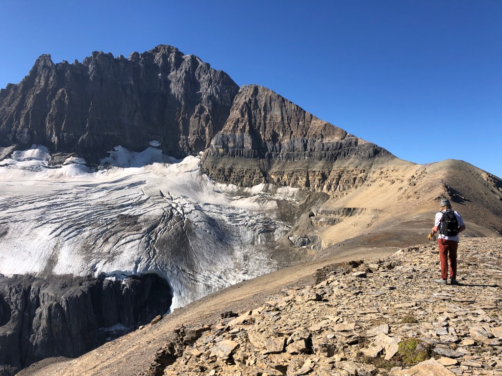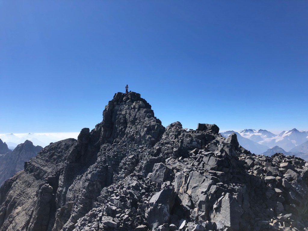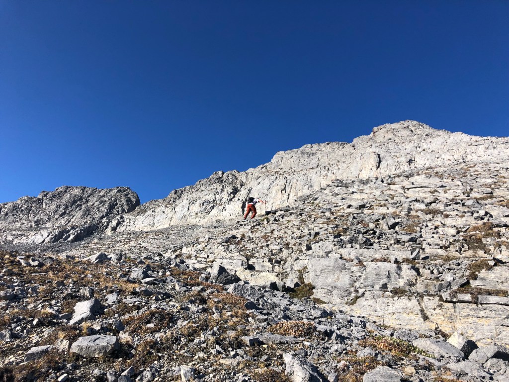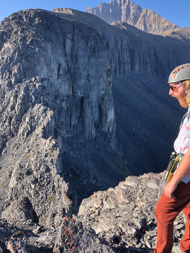 It would still be another 3 hours from the second notch before we reached the true summit that day, making this first crux our halfway point. After the second notch there is a brief easy-moderate scramble leading to a broad flat “plateau” portion of the ridge, which felt like a gentle stroll in comparison to everything else that day! Eventually the gentle-wide-flat ridge steepens and angles southwards up a rubbly slope towards the false summit (moderate scrambling). From underneath the block of the false summit there are two options for continuing. One can do as we did and stay under the false summit traversing across an exposed ledge that leads almost to the true summit. Or, one can scramble up the false summit via some switchbacks and traverse the crest of the ridge. Both options are well defined and well cairned.