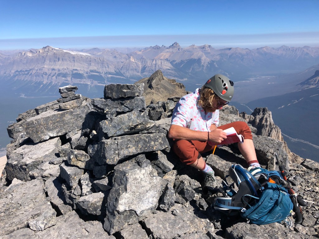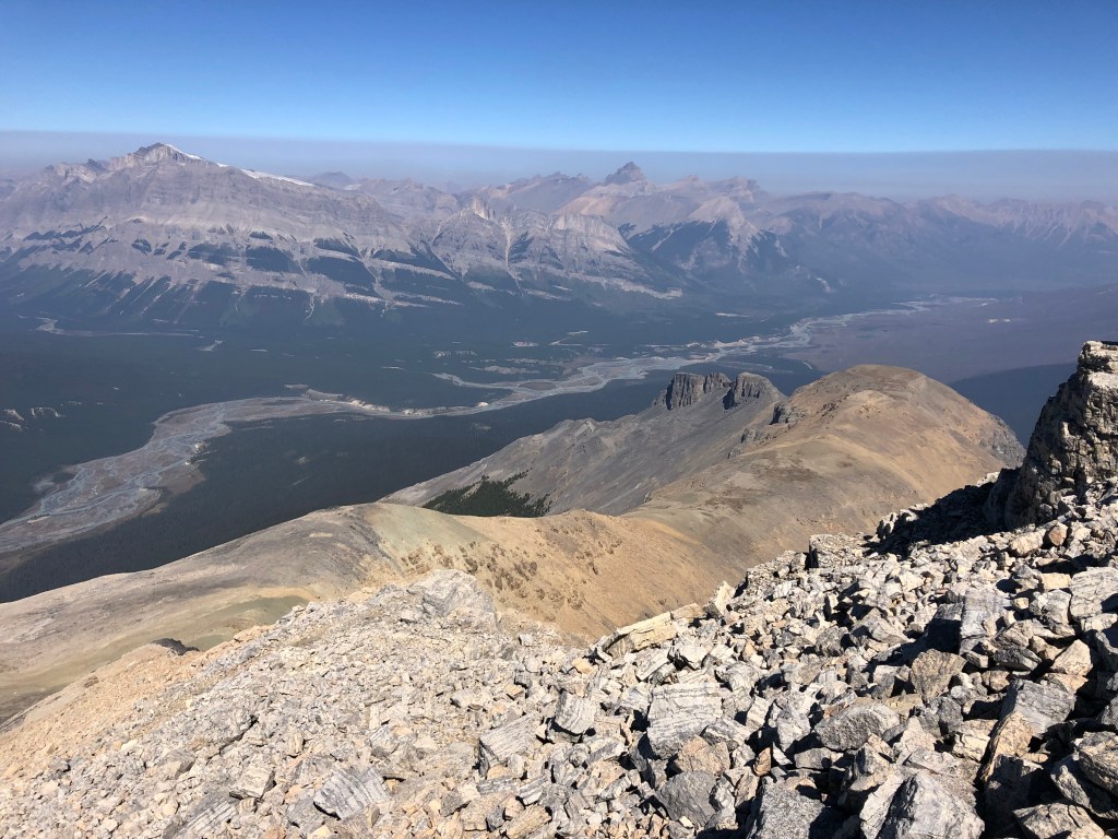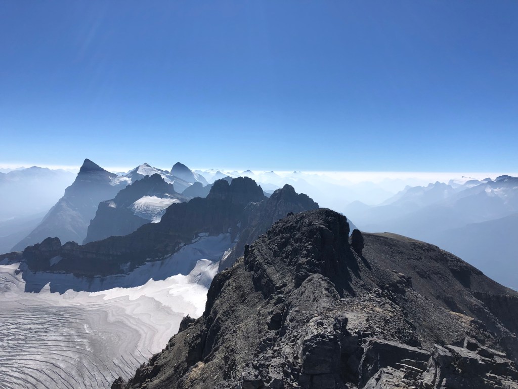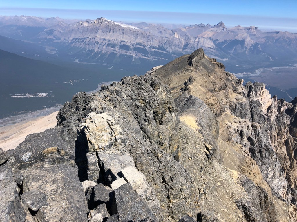 The summit block initially involved a short moderate scramble towards the top, then imposes the second formidable crux. A short 12-15m of narrow ridgeline leads to the summit proper, however these final few metres are wickedly exposed and the latter half of the ridge is especially narrow. If one is immune to vertigo, you can carefully walk across. I for one, opted to crawl across as a fall from here would certainly be fatal. The narrowest point in the ridge, a mere step away from the summit, is barely pillow-sized. Small toe holds on the east side of this narrowest step allowed me to side-rail across. Scotty has better balance and managed to walk across with minimal effort, though acknowledged the exposure had him fully focused on his footwork. We took a much needed lunch break sitting next to the summit cairn, were very lucky to pick a smoke-free summit on an otherwise bad smoke day for elsewhere in the Rockies. Our horizon was still quite smoky, making for eerie inversion-like views, however the immediate views of Mount Forbes to our west and Mount Murchison to the east were crystal clear.
