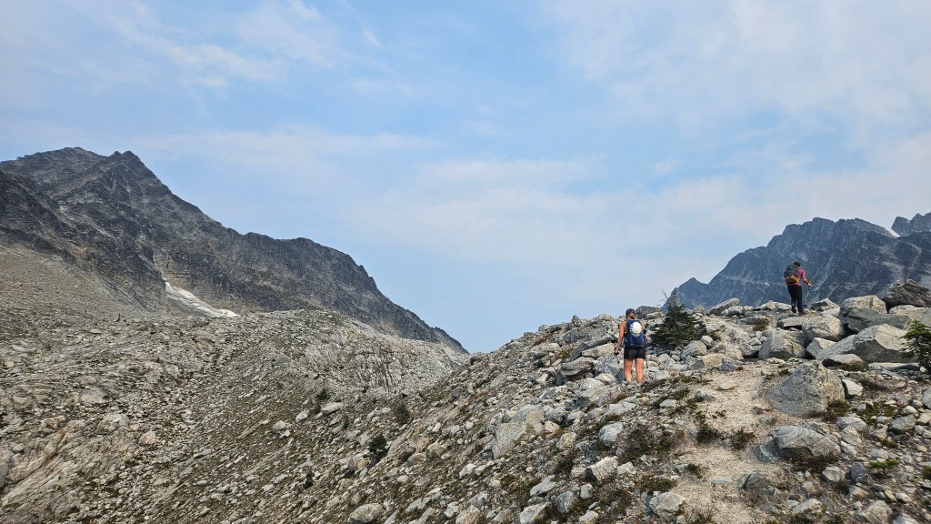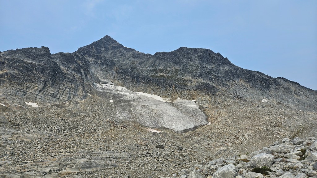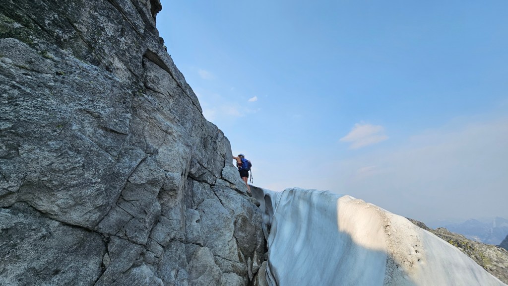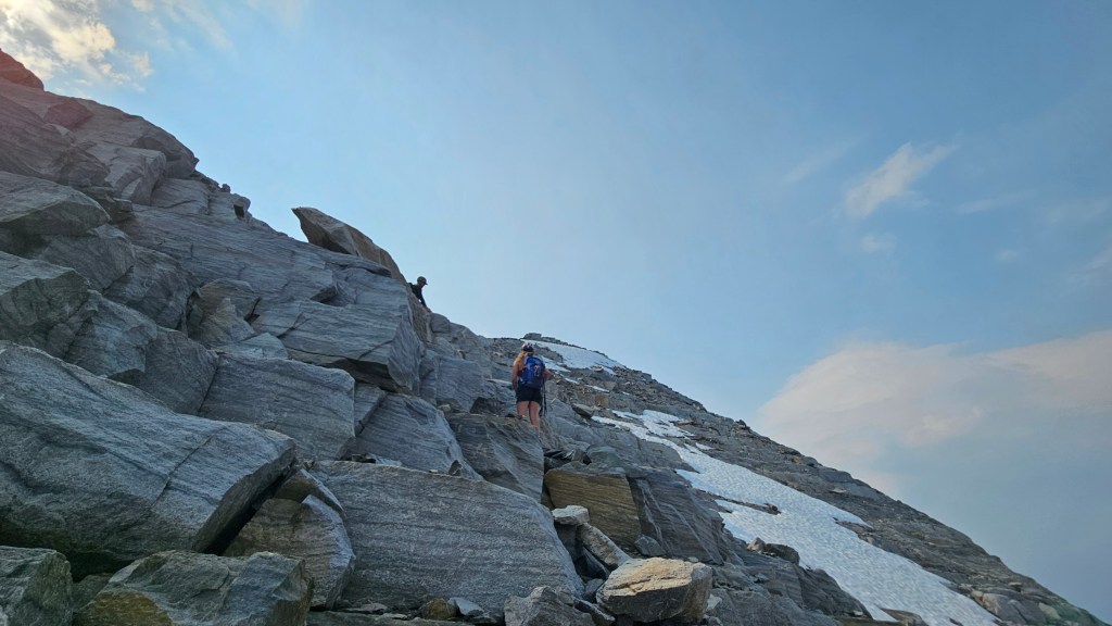 The crux for us was just above the glacier where Logan scrambled up a couple steeper cube-like rock faces with small but firm holds. We later downclimbed these and while they are exposed, the exposure is brief and the scrambling is more moderate than it first appeared. However, for the way up Bri and I instead went to the looker’s right scrambling up a small rotten gully where I slipped and kicked out the main foothold essentially eliminating this as a downclimb option for the way back. Past this point the only other hands-on bit was circumnavigating a lingering snow patch which made for a tight squeeze along a few moderate scrambling moves.