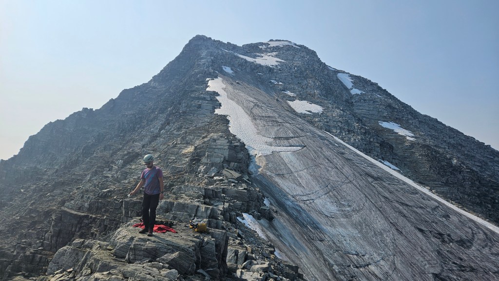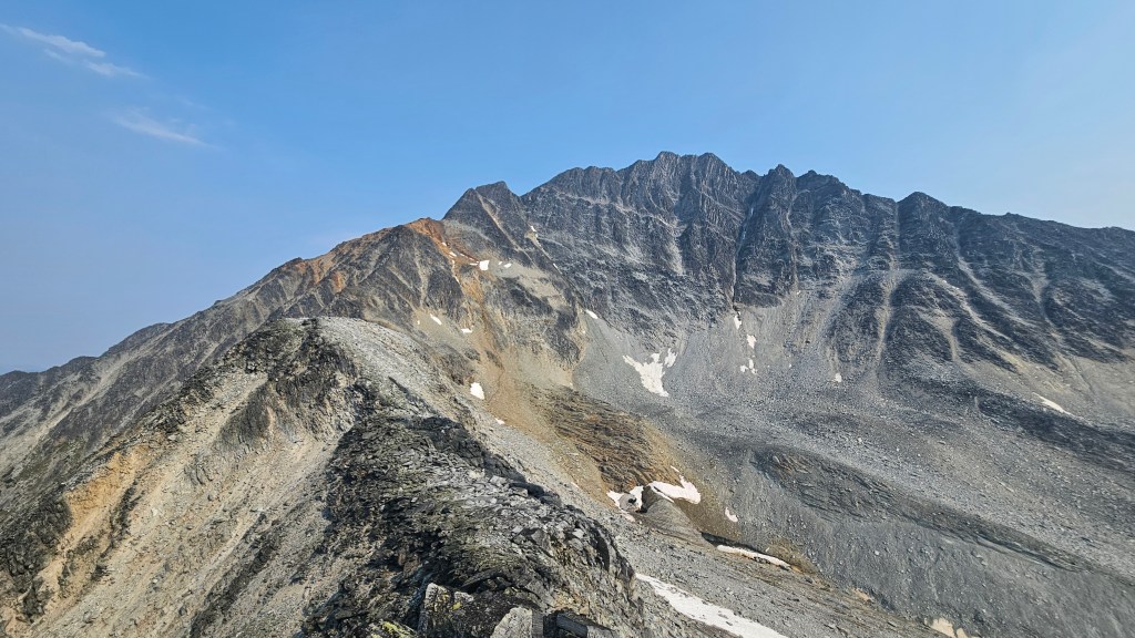 Most of what we encountered here was predominately moderate scrambling fitting the 3rd class rating. Eventually a shark fin shaped feature in the ridgeline came into few and from afar appeared crazy steep. This feature however proved to be nothing more than a continuation of what we had already encountered, and was easily traversed along the same northside ledges. If anything, from this fin feature to the top left edge of the glacier proved to be the easiest section of our day. Including our earlier mentioned detour, it took us an hour to traverse from the Sifton-Rogers col to just pass this fin feature.