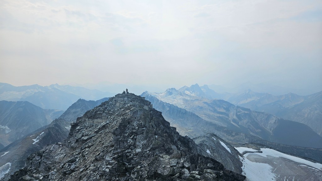 From the snow patch it was still another half hour to the summit, though once past the aforementioned crux area it was considerably easier scrambling up the final reaches of the ridge. To our surprise, Mount Sifton is topped with twin summits separated by roughly 5 minutes of moderate scrambling. Logan and I each went across at different times, curious to see which was higher as it was difficult to determine with the naked eye. Although our watches listed different heights, both watches seemed to agree that the first summit was the higher by 4 metres. We thoroughly took in the views for half an hour before readying ourselves for the downclimb.