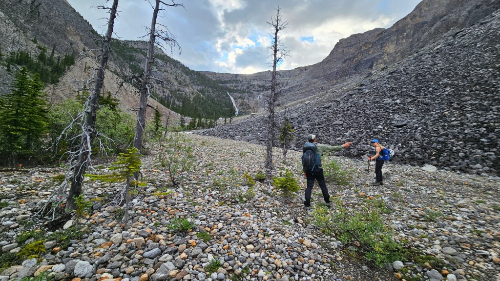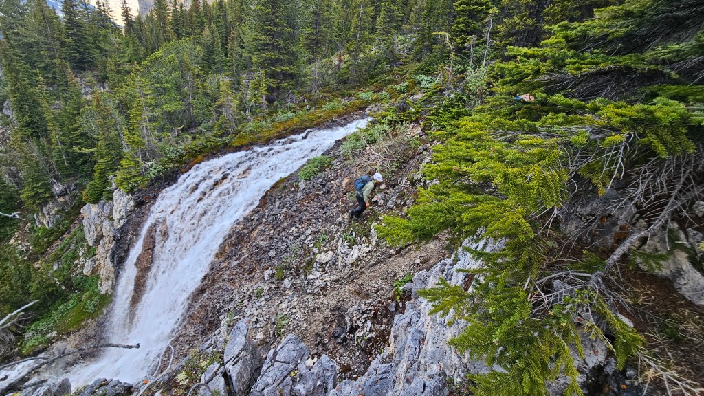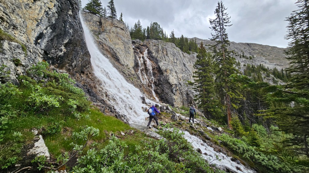 Retracing our steps from 2024, the three us set out at 6:30am making a fast hike along Noseeum Creek to the waterfalls at the headwall. This time around we aimed somewhere between the main middle waterfall and smaller one to the looker’s right (east), scrambling up a brief set of moderate ledges. Had we snooped around a few metres further to the left we would have noticed a well beaten footpath with minimal scrambling. Oh well, sometimes its more fun to go the adventure route!
