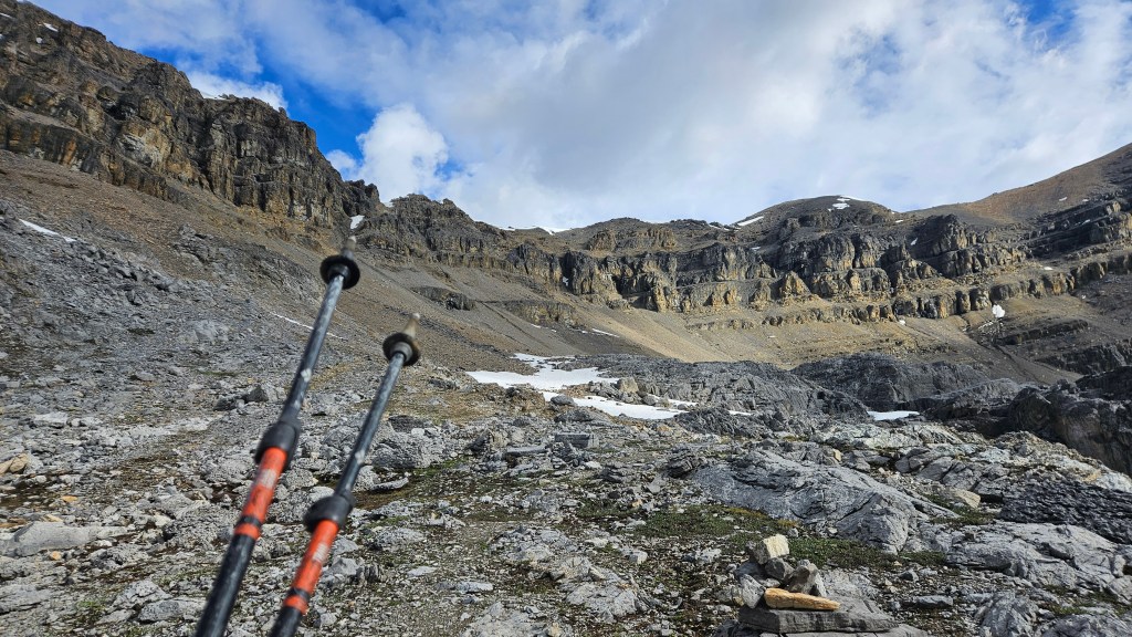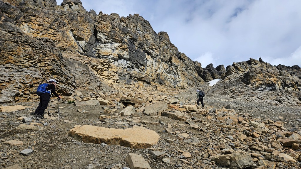 The goal with the moderate route is to aim for a distinct scree-ramp that heads up to the ridgeline. The previous year when traversing above Noseeum Lake, Bri and I misjudged the ramp by taking one gully too far north but had approached from Bearskin Peak (Noseeum 3). From Noseeum Lake, it’s quite obvious where to go and the route from the lake to the ramp is well marked with carins. The landscape between the two is quite “shattered” with cliffside features and moraines, making for some excellent photos along the way. We followed the series of large cairns to the scree ramp with minimal difficulties but occasional elevation loss/regain.