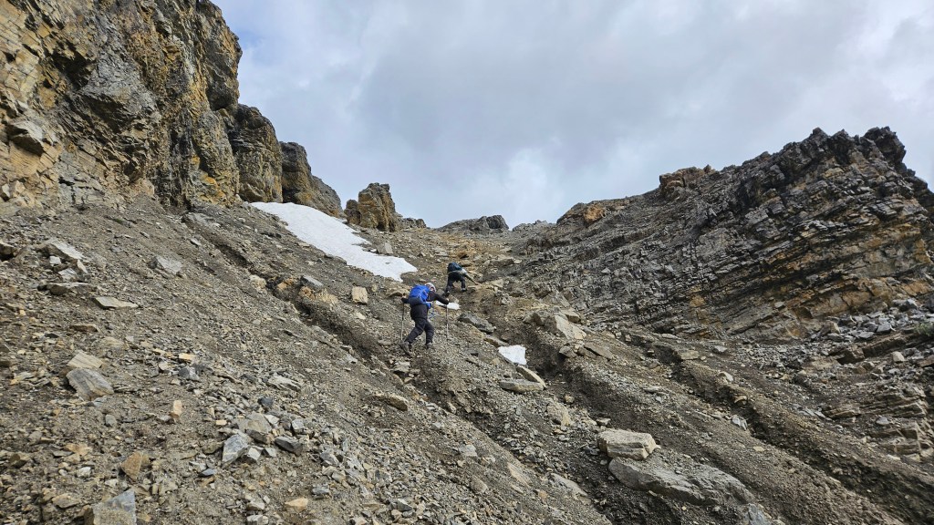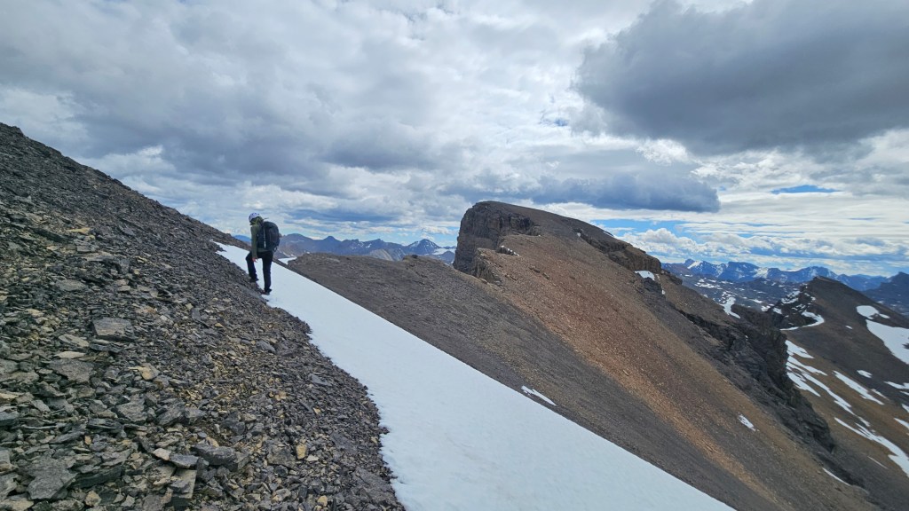 The ramp itself, as warned in Nugara’s (2017) description, is a tedious treadmilling effort to scramble up but is nontechnical. Hiking poles certainly came in handy, and the rock was loose enough that we had donned helmets for this section. The initial ramp was mostly talus, though near the snow patch the ramp shifts slightly to the climber’s right becoming much steeper and grainier. We briefly got hands-on plodding up this higher section of the ramp before intercepting the ridge crest. From the bottom of the first section, it took us around 25-30 minutes to reach the ridge and were immediately greeted by +40km/hr winds with a biting wind chill.