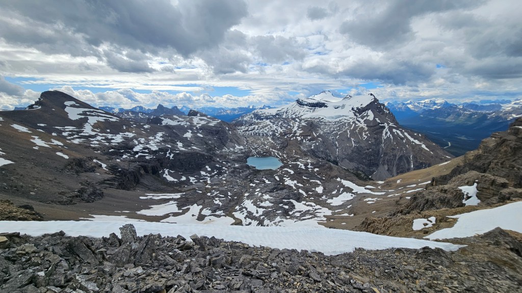 The views from this one cannot be understated, they are grand and are the only ones I’ve had (in the same area) that rival Crowfoot Mountain. According to my watch we had made it from car to summit in 4 hours 19 minutes and despite the freezing wind our stoke level was still at a 10/10. The views south of neighboring Andromache and Hector’s glaciated north faces stood out against moody skies, with Noseeum Lake’s glass-like pale blue surface centered in the foreground. I often use the analogy that Noseeum is shaped like a collapsed volcano cone, with the lake being the centre of a crater… I wonder if there is any volcanic history to this peak? We signed the register, which was a struggle in the wind, and helped ourselves to a celebratory sip of the fireball in the pink registry box.