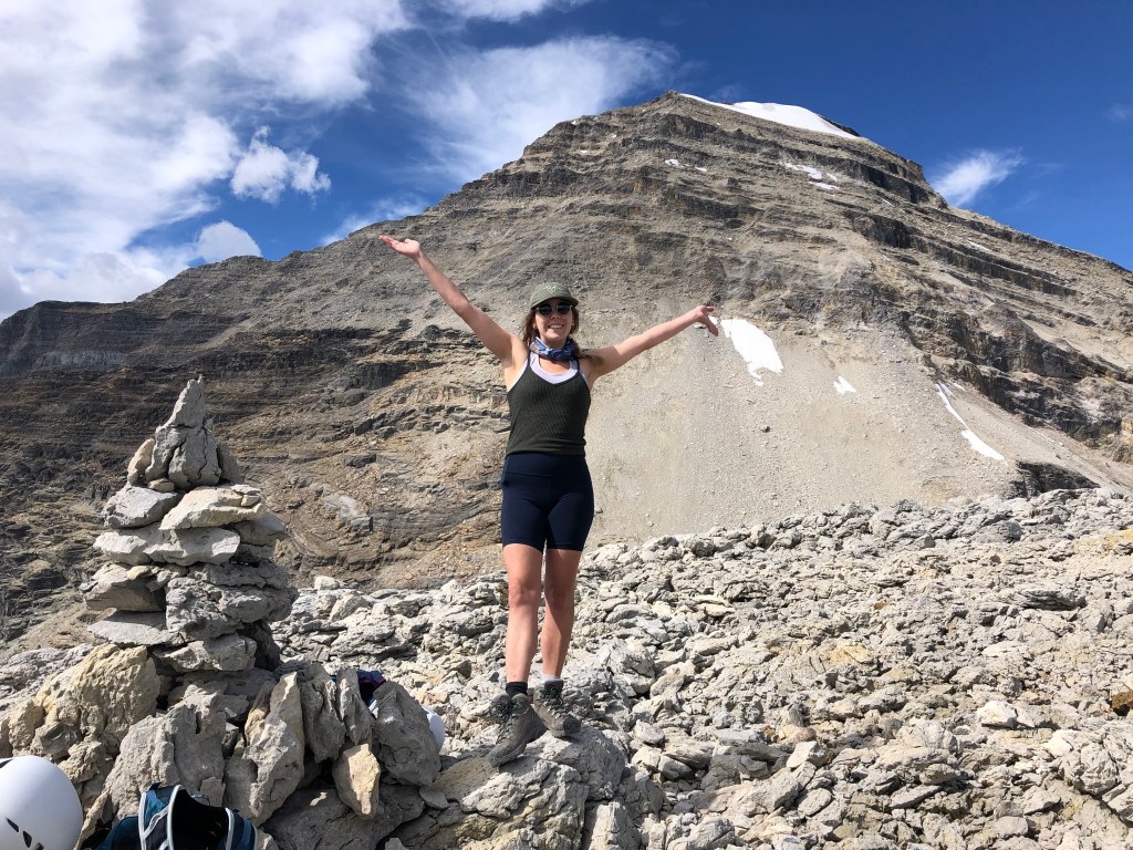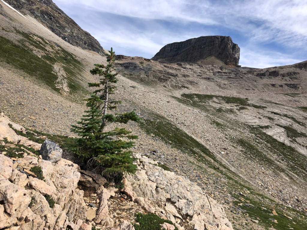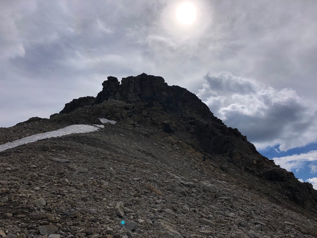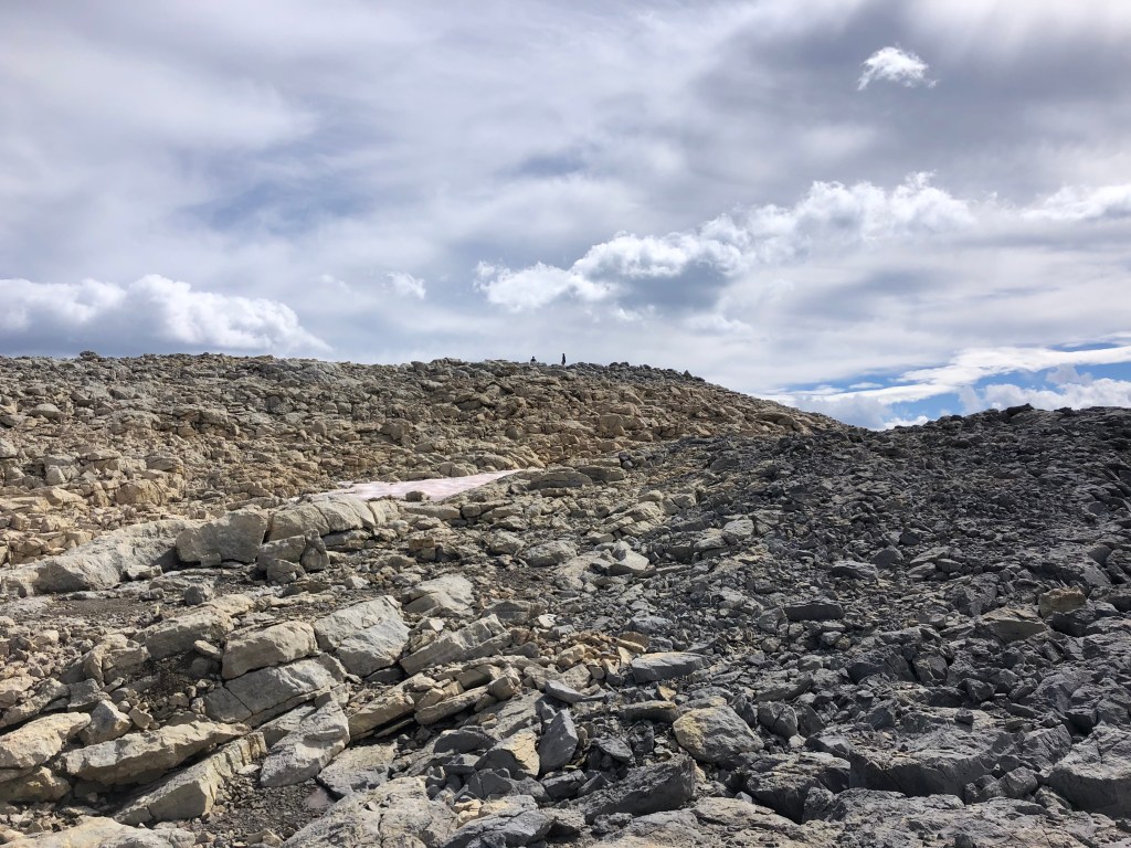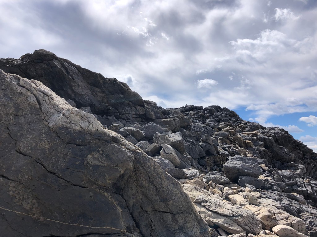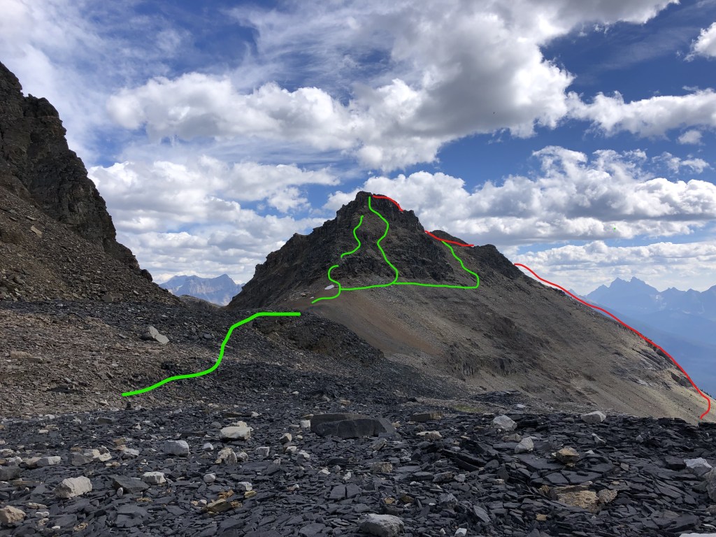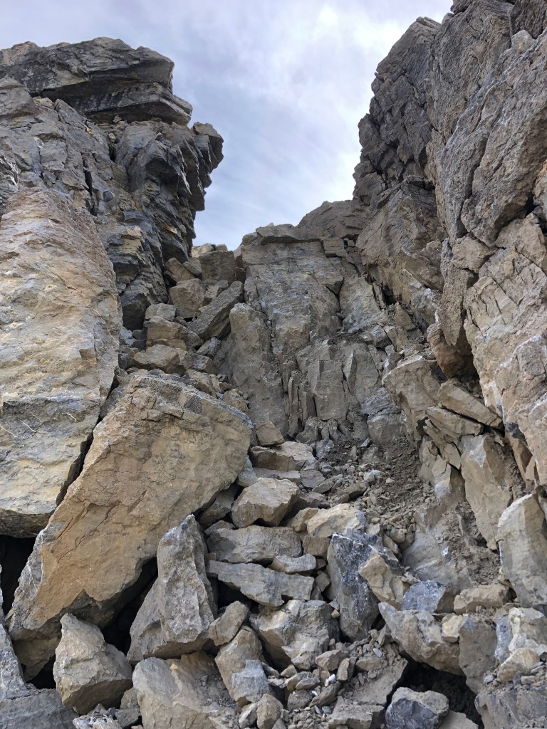 While the rock in the crux gully appeared loose, there are plenty of holds and the space quite protected. It somewhat reminded me of the crux on Eiffel Peak near Moraine Lake but this was much briefer only taking five minutes to navigate through. Once above the ‘crux’ it is an easy scramble onto progressively flatter terrain, the summit being a mere bump on an otherwise plateau of shattered rock debris.