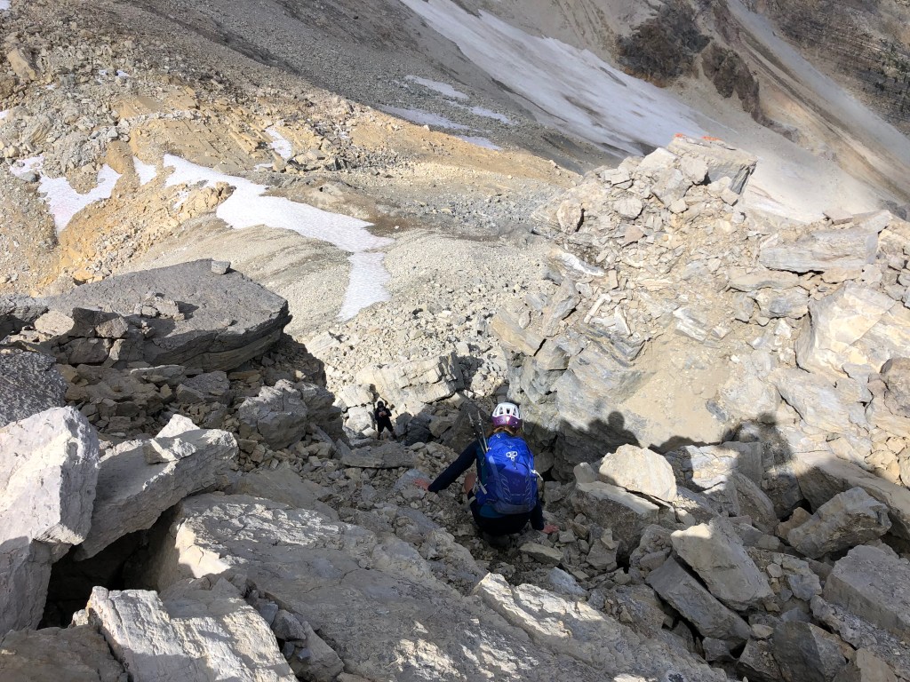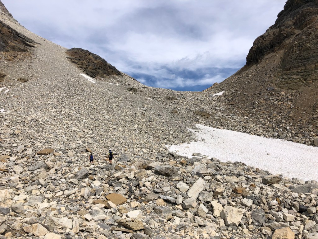 It took us 90 minutes from the creek crossing at Hamilton Lake to reach the high pass and crux of the scramble. While the scrambling is easy, the towering ledges from Top Hat and Carnarvon are a falling rock hazard and we opted to wear helmets for the final thirty minutes leading up to the pass. Once you’ve topped out at the pass, follow the saddle east (looker’s right) towards the rear of Top Hat.
