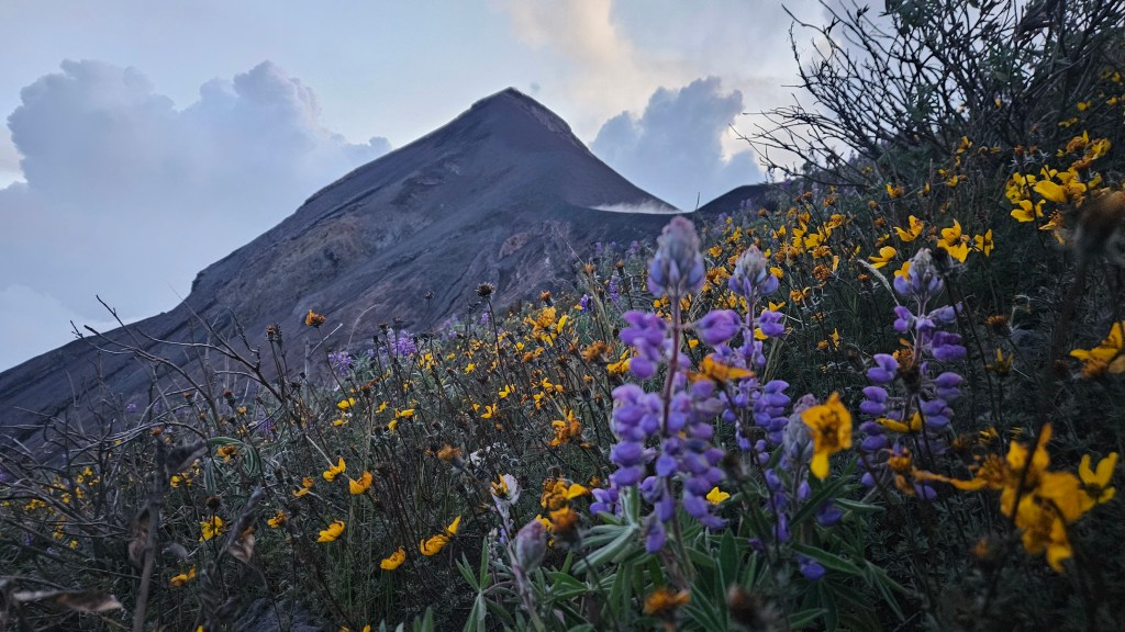Bri and I along with several others in the group paid the extra fee to hike to the Fuego viewpoint that evening for an up close view of the eruptions. After dropping some kit off at the hut and grabbing our headlamps, we left around 5pm. The trail was a bit rougher versus the main track up to basecamp, with lots of volcanic scree. The route led down a natural saddle between the two volcanoes before climbing back up (roughly 300m loss/gain one way), the tussock and thorny flowers reminding us our past adventures in New Zealand.